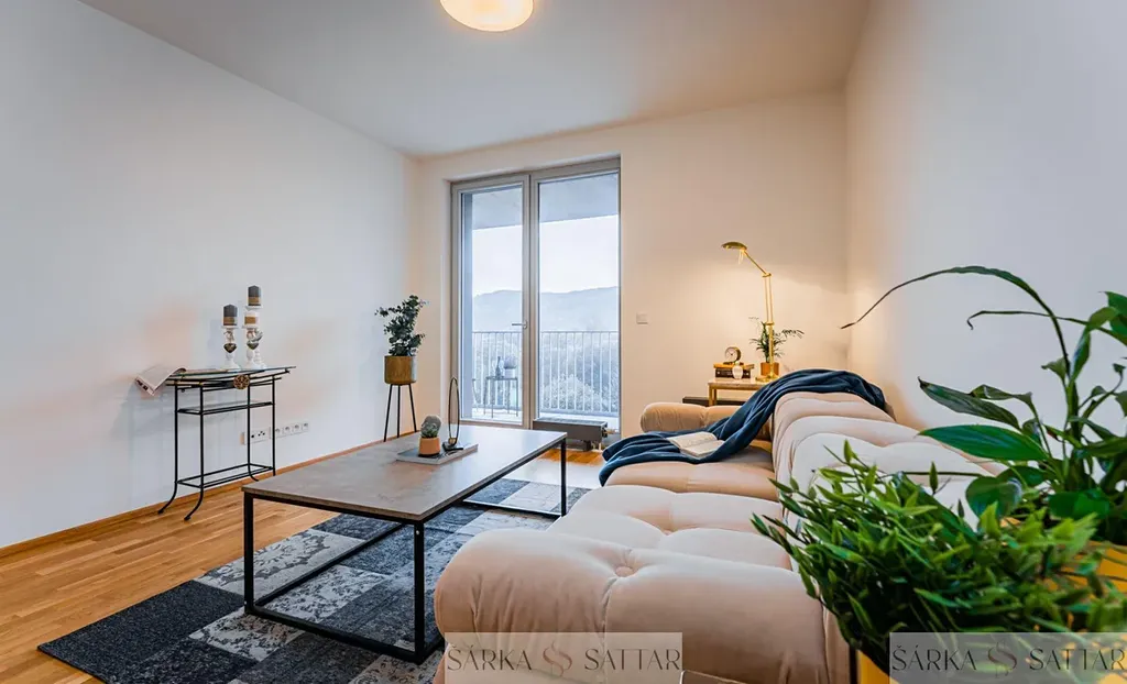 Exkluzivně vám nabízíme na pronájem slunný byt 2+kk 58m2 plus lodžie 15m2, garážové stání a sklep v 4.NP moderní nové Residence Zahálka, Mezi Vodami 47.