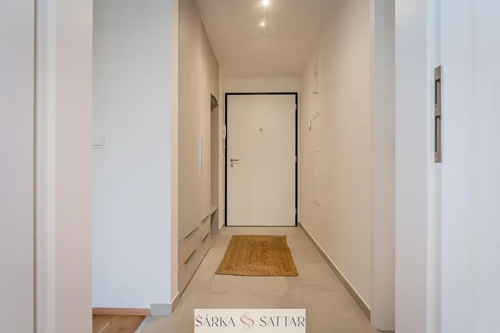 velkorysou předsíň s vestavěnými skříněmi, botníkem a odkládací plochou, koupelnu s prostornými skříňkami, obývacím prostorem s kuchyňským koutem, ložnici a lodžii.