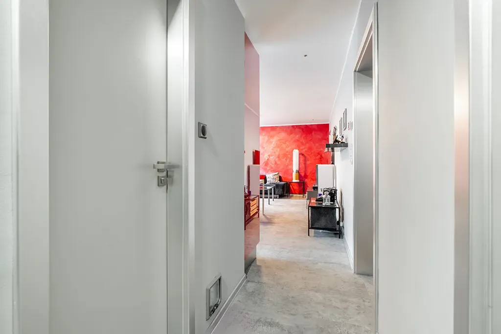 Byt nabízí velkorysý obývací prostor s kuchyňským koutem, který tvoří přirozené centrum bydlení. Moderní kuchyňská linka má dostatek úložného prostoru s vestavěnými spotřebiči.