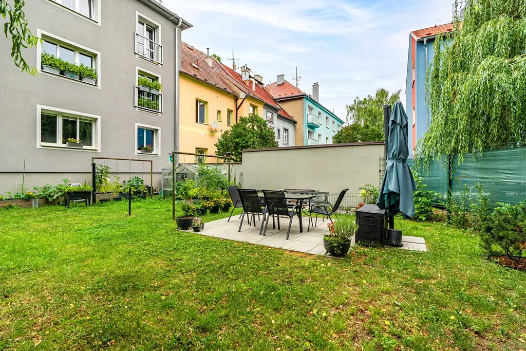 K bytu náleží vyvýšené záhony, skleník a místo na grilování a společné posezení.