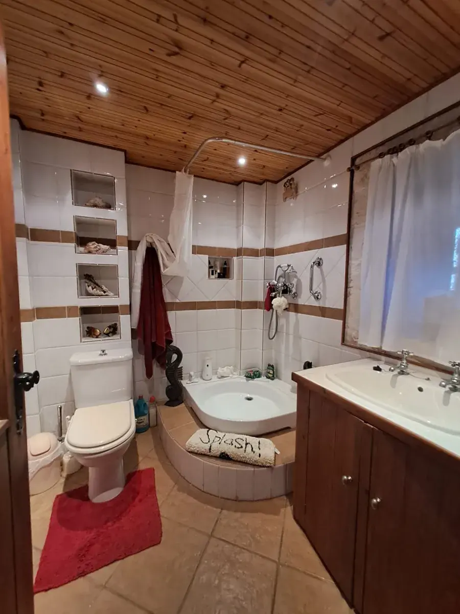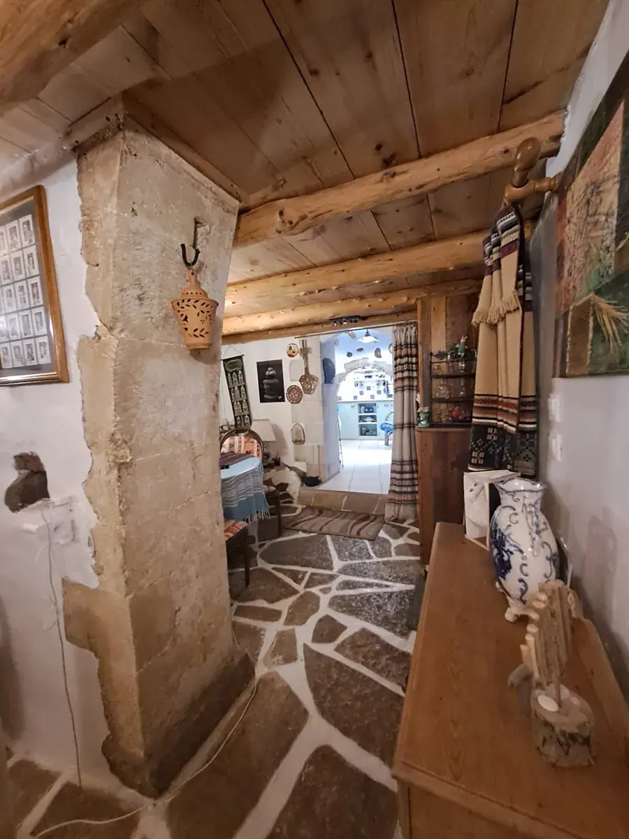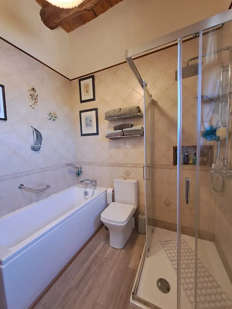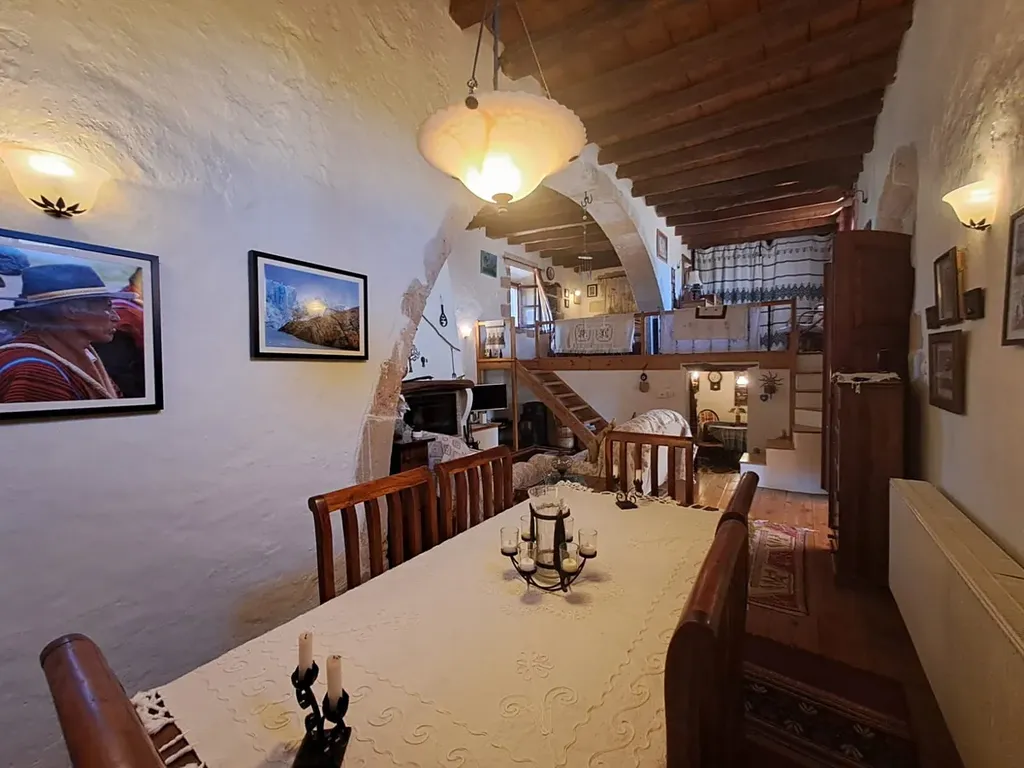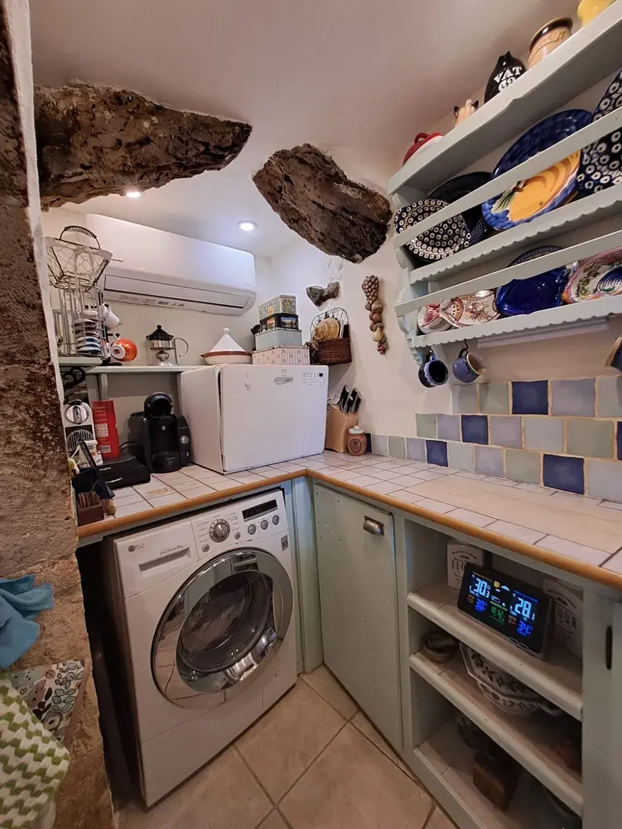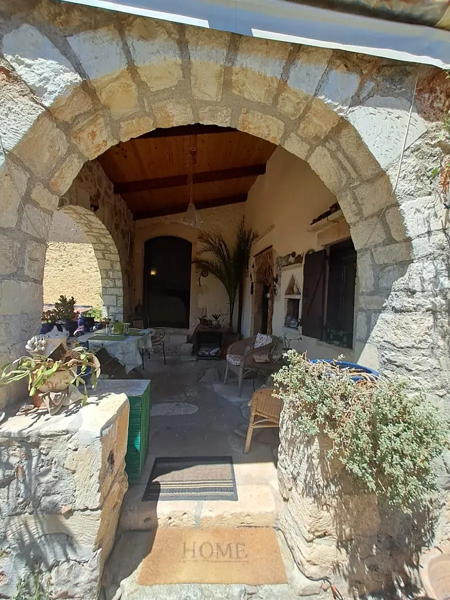 Nemovitost je obehnána vysokými zdmi, které poskytují soukromí a venkovní prostor ve stylu dvora, ideální pro relaxaci nebo zábavu. Hlavní dům má půdorys ve tvaru L s flexibilními obytnými prostory. Nabízí plně vybavenou kuchyň s původním výklenkem pro pec, jídelní kout, kancelářský koutek a vysoký obývací pokoj s ložnicí v mezipatře a koupelnu ve zvýšené poloze. Design kombinuje tradiční prvky s moderním komfortem.