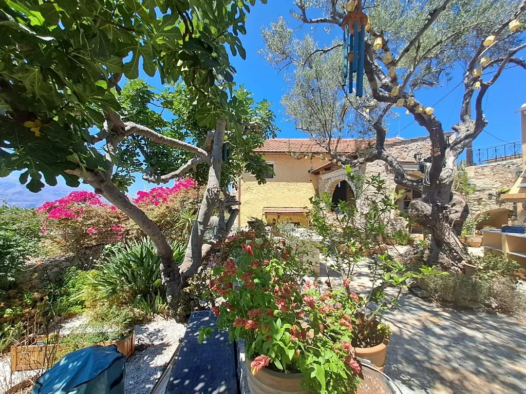 Zahrada je dobře udržovaná s rozmanitými rostlinami, zastíněnými posezeními, kamenným grilem, vířivkou a velkou krytou terasou pro venkovní stolování. Schody vedou na střešní terasu s otevřeným výhledem na vesnici a blízké hory.