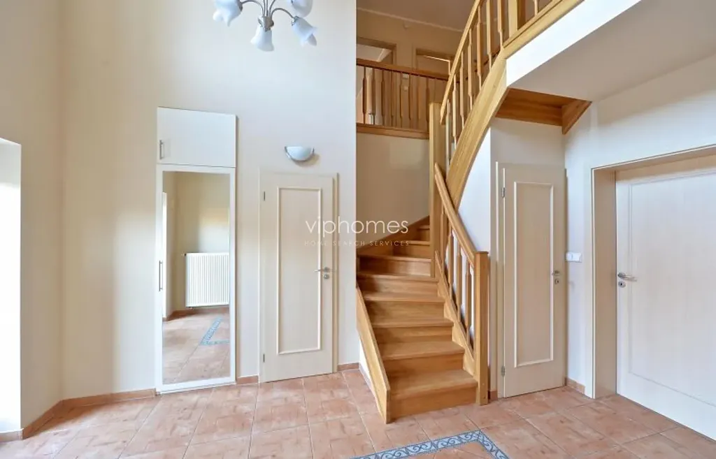 Dům zahrnuje 4 ložnice, 3 koupelny, plně vybavenou moderní kuchyň s přímým vstupem na terasu, prostorný obývací pokoj. Ve všech koupelnách a místnostech s dlažbou je podlahové topení. Garáž pro 2 auta, dřevěné podlahy, vestavěné skříně, balkón, terasa a udržovaná zahrada.