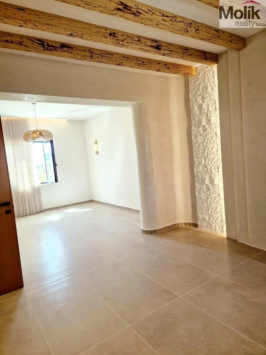 Otevřený prostor obývacího pokoje + kuchyně s přímým přístupem do zahrady za domem, kde se nachází bazén