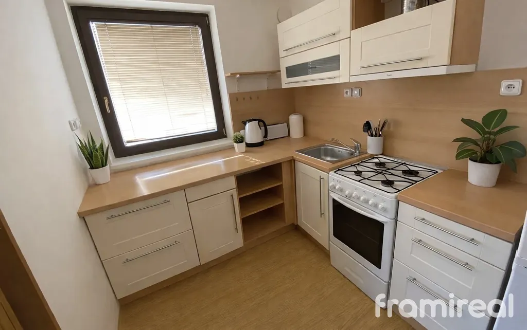 Byt je udržovaný a částečně zařízený. K dispozici je kuchyňská linka včetně lednice, v obývacím pokoji a na chodbě jsou praktické vestavěné úložné prostory. Koupelna je vybavena pračkou. Všechna okna bytu jsou opatřena žaluziemi a sítěmi proti hmyzu. Dispoziční řešení bytu zahrnuje neprůchozí pokoje, které poskytují dostatek soukromí a komfortní bydlení.