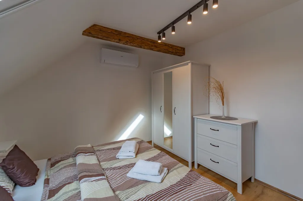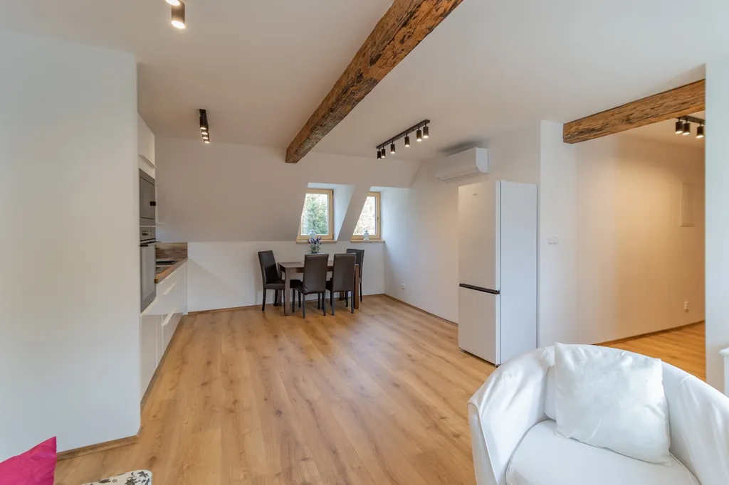 Apartmán č. 2. o podlahové ploše 48,3 m2 je kompletně moderně a vkusně vybavený jak elektrospotřebiči, tak nábytkem. Vnitřní dispozice 2+kk v 1. NP: vstupní předsíň, kuchyňský kout - kuchyňská linka zn. Oresi ( s el. horkovzdušnou troubou s indukční deskou, mikrovlnnou troubou, lednicí s mrazákem zn. Mora). Jídelní koutek s obývacím prostorem včetně nábytku a TV ; ložnice. Koupelna (se sprchovým koutem, umyvadlem, topným žebříkem a připojením k pračce, baterie – Grohe, sanita - Geberit), samostatné WC. V rámci rekonstrukce bylo provedeno zaizolování stropů, položeny protihlukové podlahy, plovoucí podlaha zn. Quick – Step a protihlukové stěny mezi apartmány, okna dřevěná s trojskly. Vytápění je řešeno klimatizací Haier - ovládanou tel., vjezdová brána ovládaná tel. a kódovým systémem, samostatné připojení wifi, kamerový systém. K bytu náleží vlastní venkovní prostor k posezením, kój (5m2), jedno parkovací stání u domu a společné venkovní prostory k odpočinku. Voda čerpána z vrtané studny, odpad řešen ČOV. V rezidenci je dále k dispozici využití sauny a fitness.