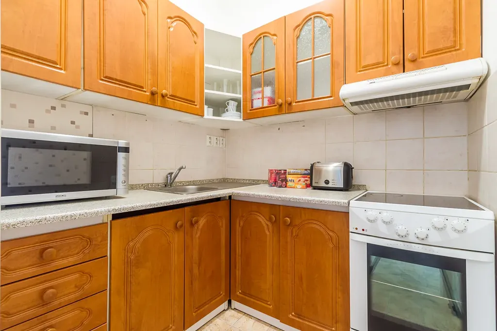 Kuchyně je vybavená elektrickou varnou deskou, troubou a mikrovlnkou, lednice s mrazákem.