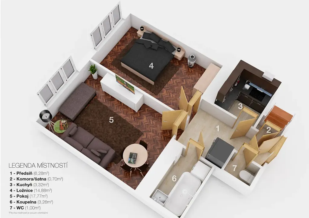 V ložnici není postel, dostatek úložného prostoru nabízí prostorná šatní skříň.