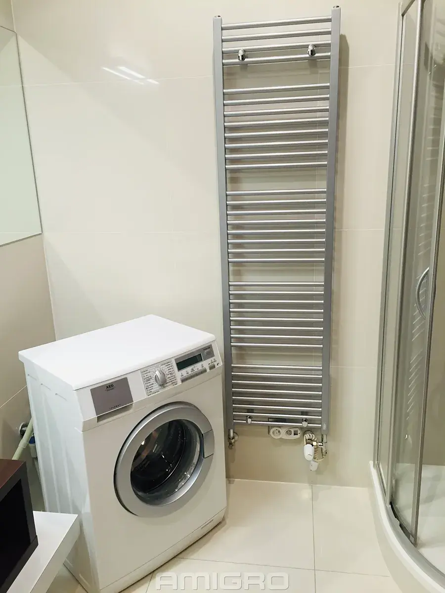 Byt je vybaven nábytkem na míru (kuchyňská linka včetně spotřebičů - lednice, sklokeramická deska, trouba, myčka nádobí, dále jídelní stůl, komody, sedací souprava, postel, šatní skříň, pračka, TV, apod.).