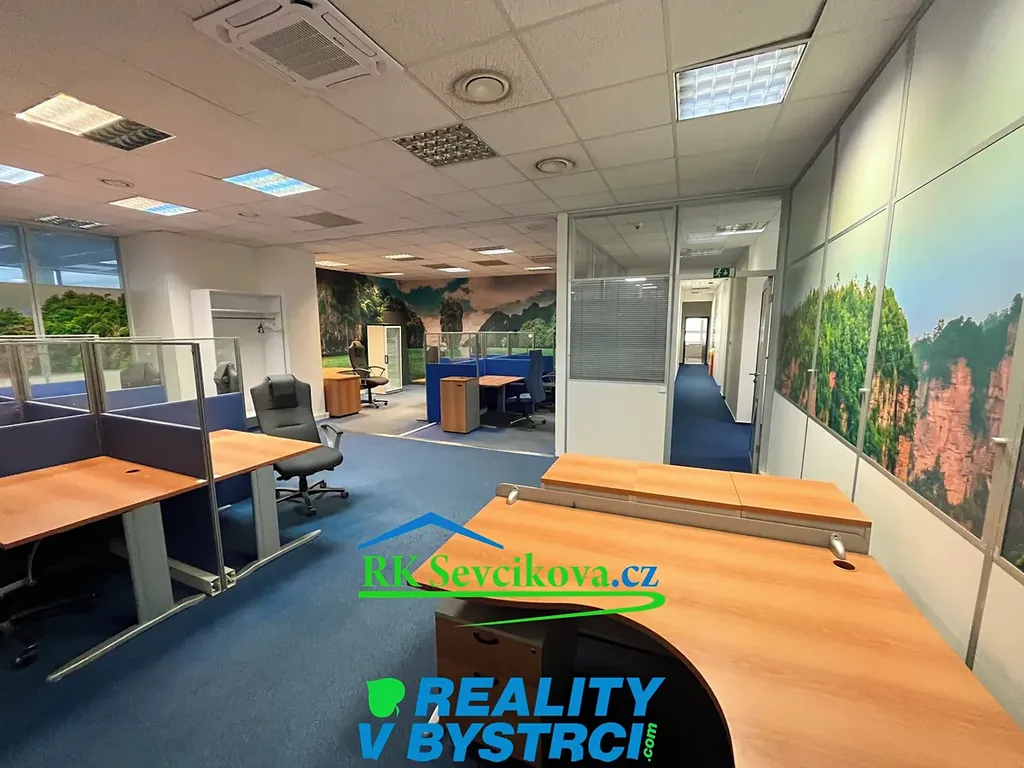 Místnost je vybavena kancelářským nábytkem, kobercem, výlohami. Možnost propojení dveřmi s obchodní částí komplexu.