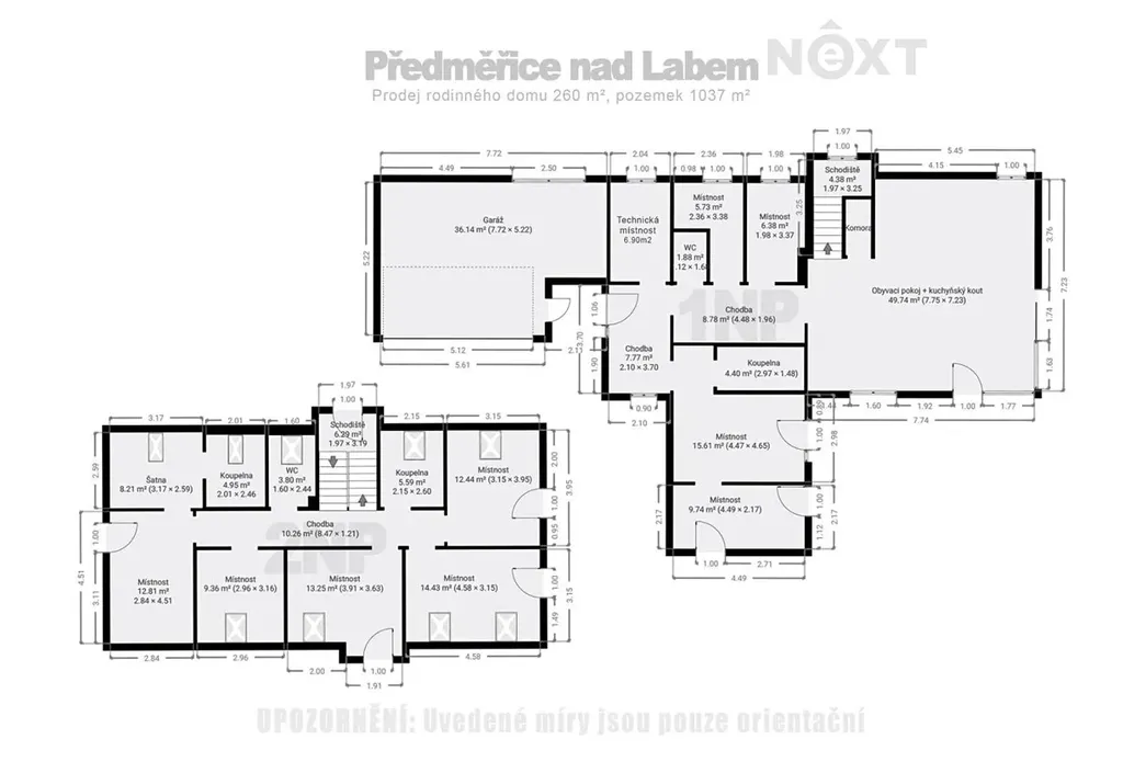 Jste velká rodina, která potřebuje hodně prostoru a zároveň soukromí pro všechny zúčastněné? Pak mám pro Vás moderní dvoupodlažní rodinný dům v klidné části dynamicky se rozvíjející obce Předměřice nad Labem, s pozemkem o celkové výměře 1037 m². Jedná se o novostavbu s důrazem na kvalitu použitých materiálů. Výstavba byla započata 12/2022 a dokončena 04/2025. Dům se momentálně nachází ve fázi, kde jsou hotové vnitřní sádrové omítky a je vše připraveno pro finální dokončení dle individuálního vkusu nového majitele. Dispozičně se jedná celkově o 11kk s podlahovou plochou 260 m² s garáží pro dvě auta. Garáž je osazena sekčními vraty značky Hörmann a je propojena se vstupem do domu. Výhodou je samostatná bytová jednotka o dispozici 2kk (cca 30 m²) s vlastní koupelnou a přípravou na kuchyň, která má vchod hned ze vstupní chodby domu. Tento prostor je ideální jako kancelář, nebo útočiště pro skoro dospělého puberťáka. Přízemí tvoří otevřený obytný prostor s kuchyní o rozloze 50 m² a přípravou na kuchyňský ostrůvek. O spojení s venkovním prostorem se postará rohový velkoformátový HS portál. V přízemí domu se dále nachází pracovna, šatna, technická místnost, samostatné WC a prostorná chodba s dostatkem místa pro vestavěné skříně. V patře se nachází hlavní ložnice s walk-in šatnou a koupelnou. Čtyři samostatné pokoje, které lze využít jako ložnice, dětské pokoje nebo třeba domácí pracovny. Technicky je dům řešen s ohledem na nejnovější standardy. V domě je přípraven rozvod centrálního vysavače, domovního videotelefonu, předokenních rolet a klimatizace. Obvodové stěny z cihel jsou zatepleny silnou 160 mm vrstvou izolace. Střecha je ze skládaných střešních tašek. Plastová okna v moderní barvě antracitu, v patře střešní okna Velux. Vytápění zajišťuje podlahové topení napojené na tepelné čerpadlo (vzduch-voda). Ohřev pitné vody v 190l zásobníku zajišťuje taktéž tepelné čerpadlo. Pitná voda je zajištěna připojením domu na veřejný vodovod, stejně tak je dům připojen na veřejnou kanalizaci. Tato nemovitost představuje jedinečnou příležitost spojit radost z novostavby, kterou si můžete dotvořit dle vlastních představ. Pro komunikaci uvádějte evidenční číslo zakázky N115970.