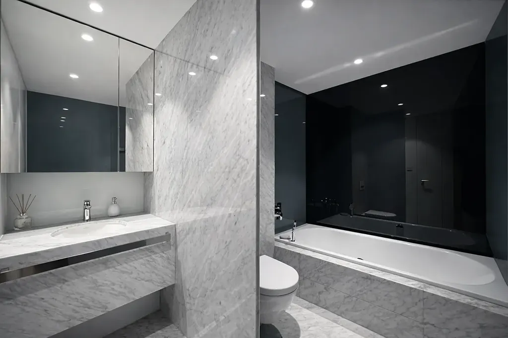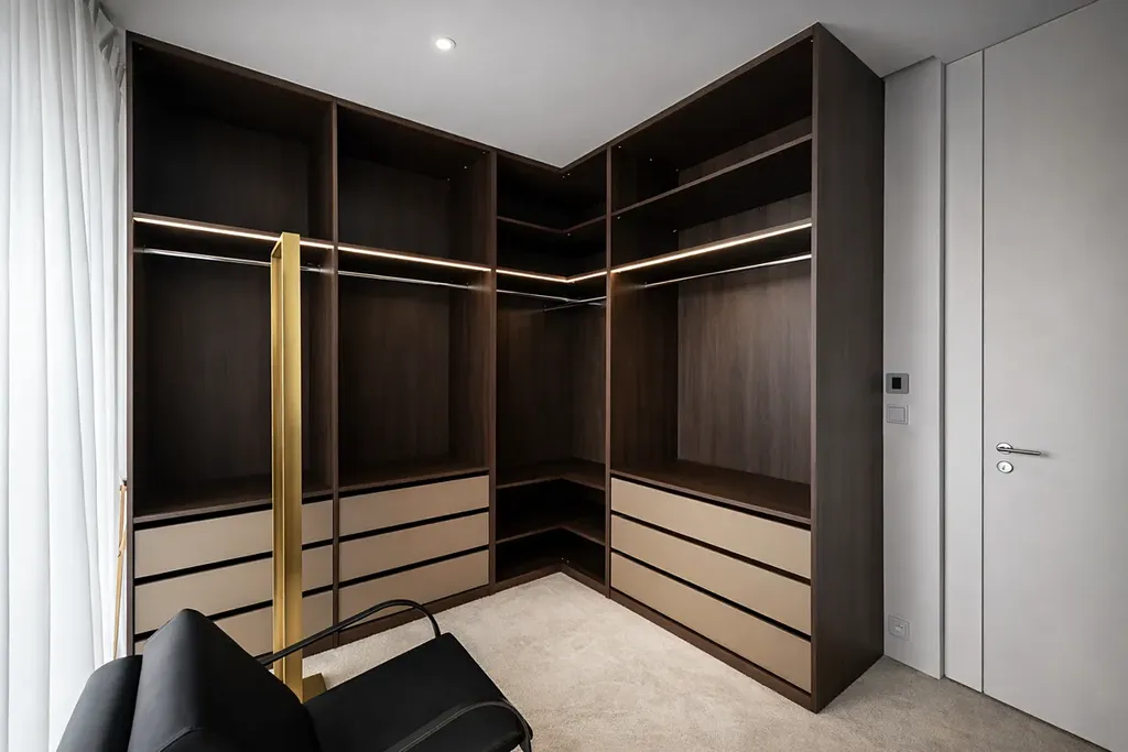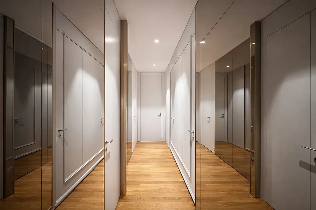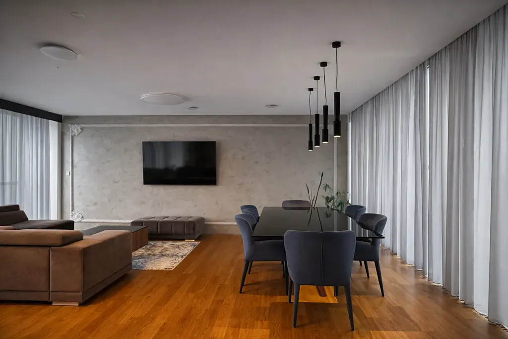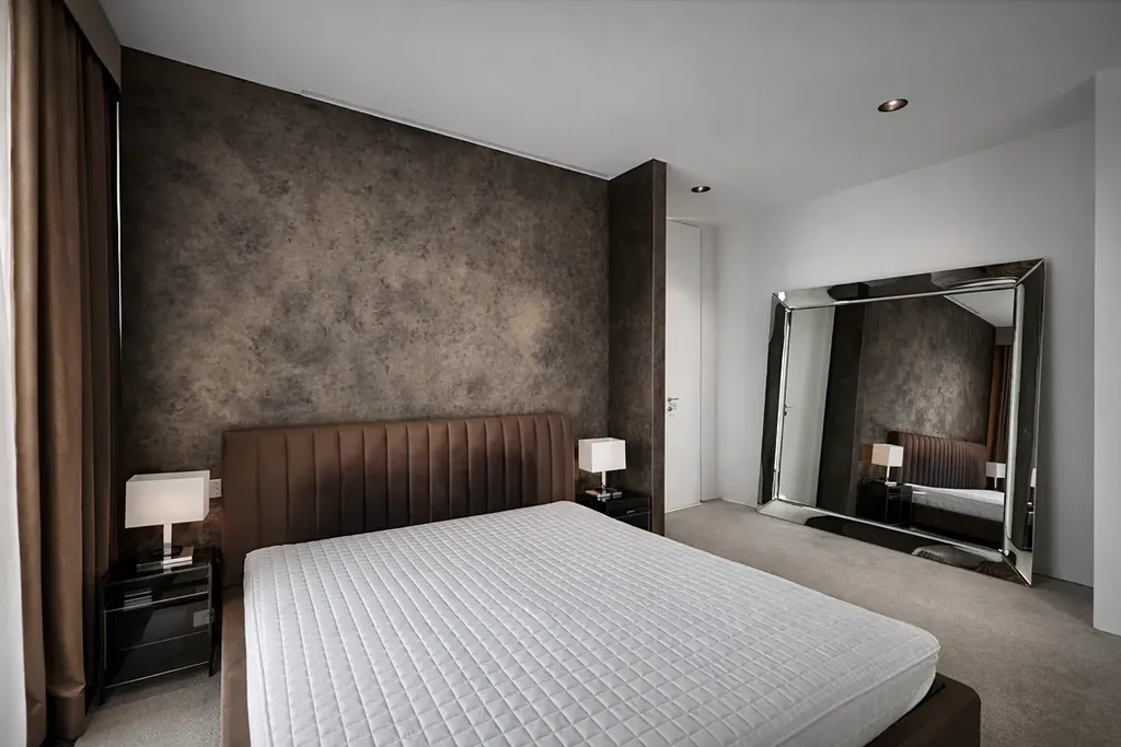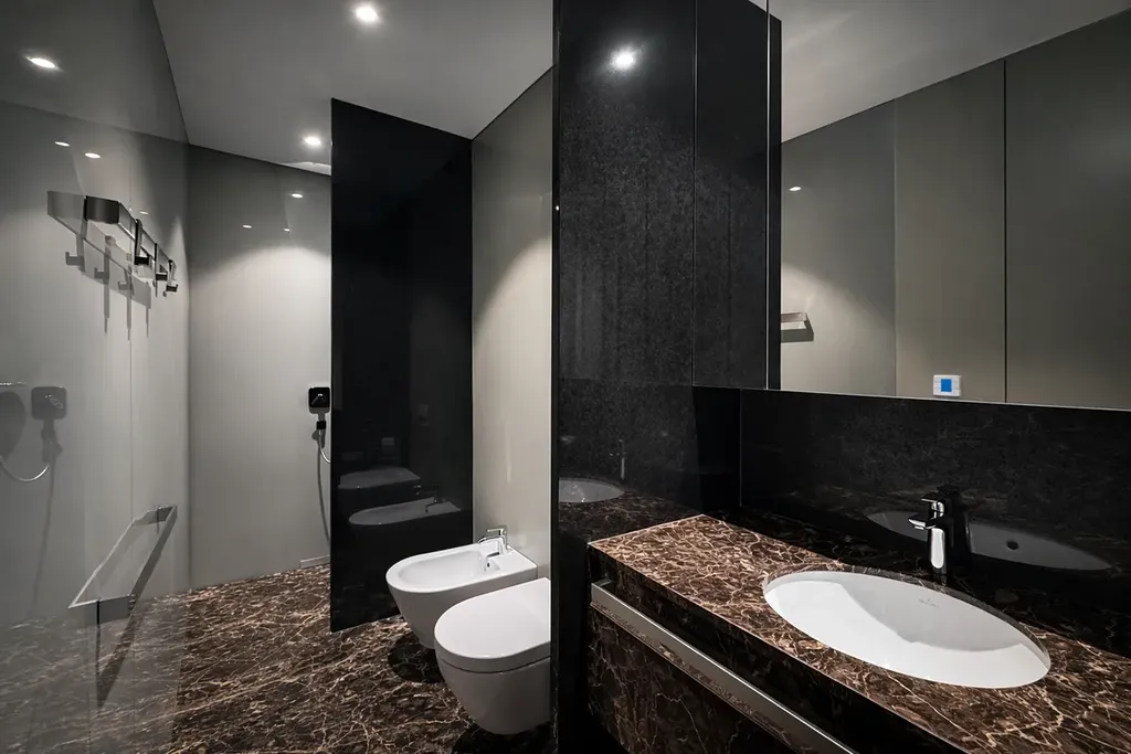 Byt o dispozici 4+kk se nachází v 11. patře a nabízí podlahovou plochu 141 m². Součástí jsou terasy o celkové výměře 44 m², ze kterých si užijete dechberoucí výhledy na Prahu ve dne i v noci. Dominantou interiéru je prostorný obývací pokoj s kuchyňskou linkou s kamennou pracovní deskou a spotřebiči značky Siemens. Byt dále disponuje dvěma ložnicemi, z nichž každá má vlastní mramorovou koupelnu, a třetím pokojem, který slouží jako šatna. K dispozici je také společná koupelna se sprchovým koutem přístupná z chodby, samostatná toaleta, a prádelna/technická místnost.