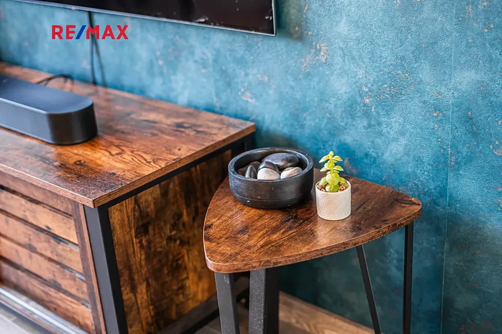 Interiér je moderní, čistý a má svůj rukopis: kombinace dřeva, tlumených tónů a výrazných akcentů působí současně, ale ne okázale.
