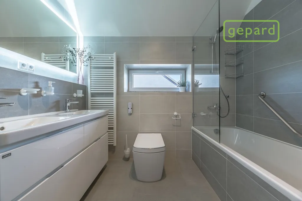 Dům vybaven ve standardu tepelným čerpadlem, lokální rekuperací, přípravou na fotovoltaiku, podlahovým vytápěním, okny s trojskly, přípravou na stínící techniku, akumulační nádrží na dešťovou vodu, využitelnou k zalévání zahrady.