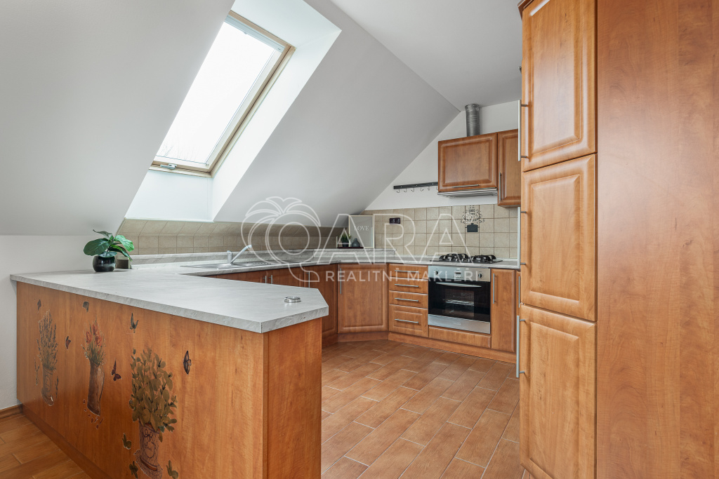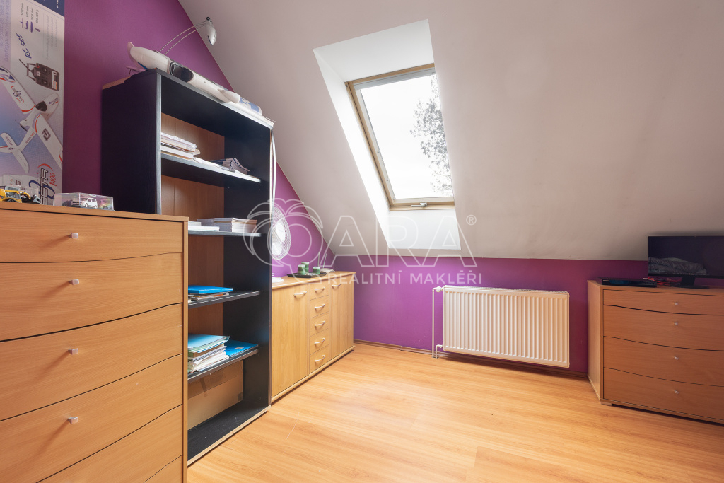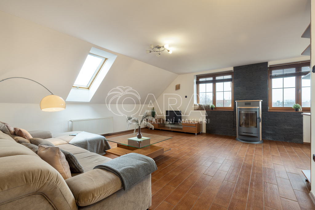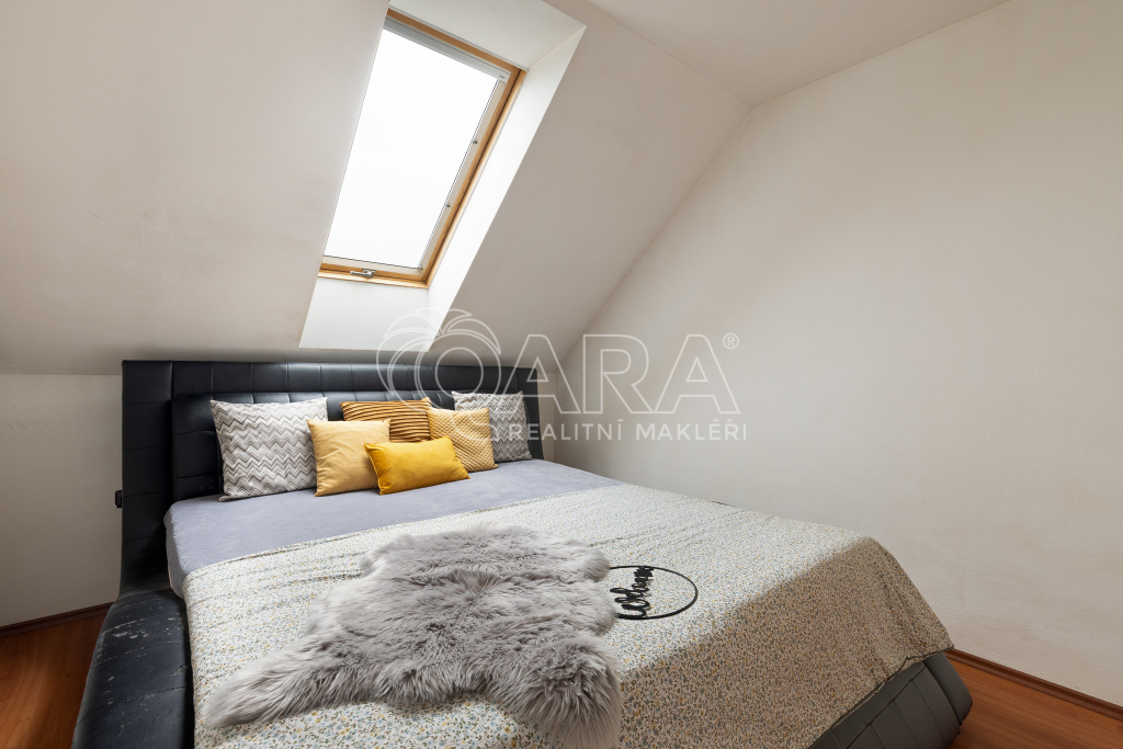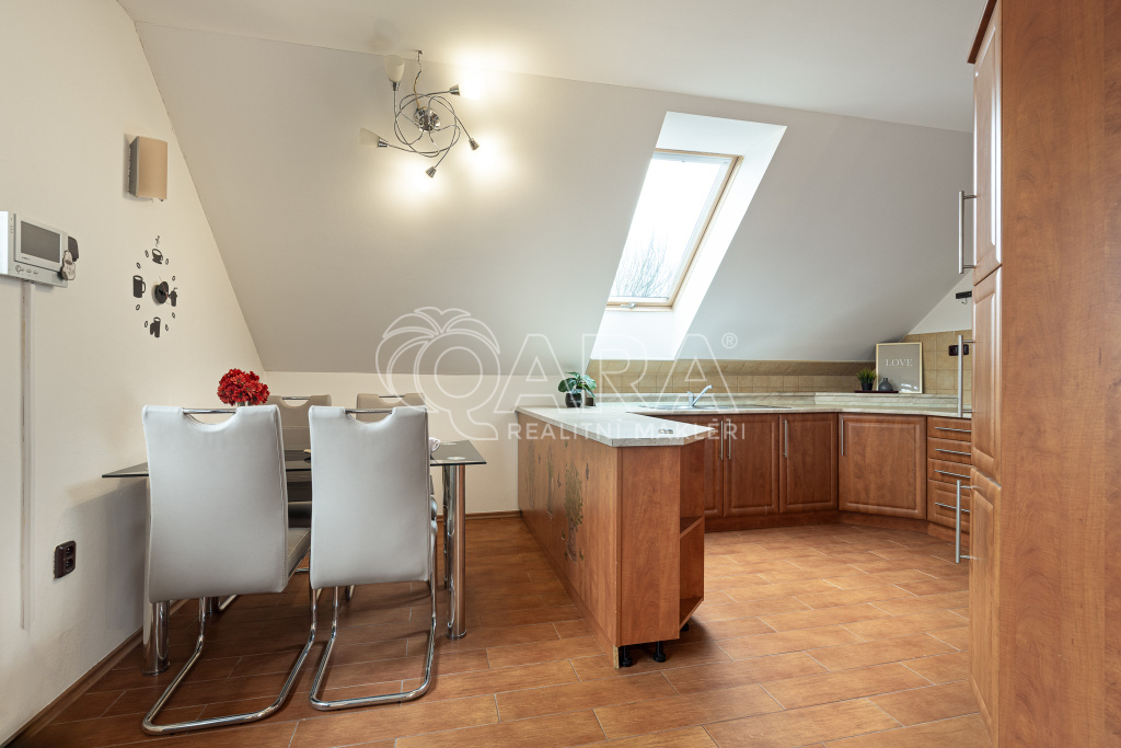 Byt v patře Vám nabízí velkoryse řešený otevřený prostor spojením obývacího pokoje s kuchyní. Kuchyně je vybavena plynovou varnou deskou, elektrickou troubou a lednicí s mrazákem. V jídelním koutě se nachází stůl se židlemi. Pokoje jsou neprůchozí se střešními okny Velux. Koupelna je zařízena masážní rohovou vanou, sprchovým koutem a 2 umyvadly. Úložné prostory nabízejí skříně u schodiště nebo v pokojích. Za horkých letních dnů určitě oceníte altánek s kuchyňkou a venkovní gril, kde si rádi posedíte s přáteli a dopřejete si kafíčko nebo grilovaný stejk.