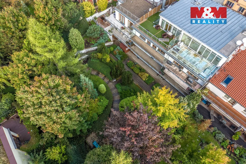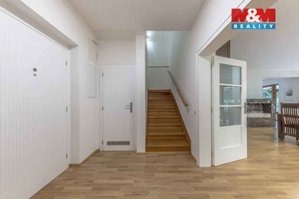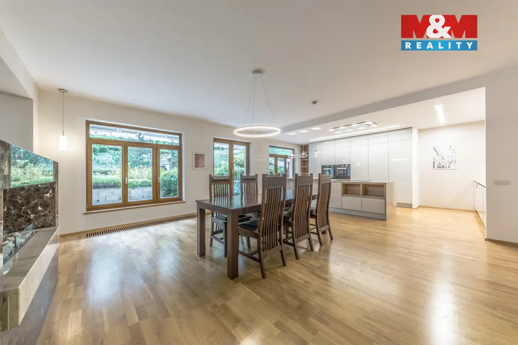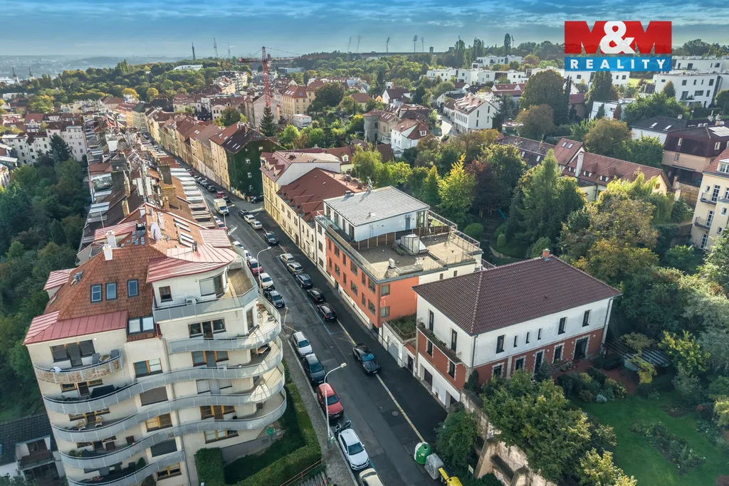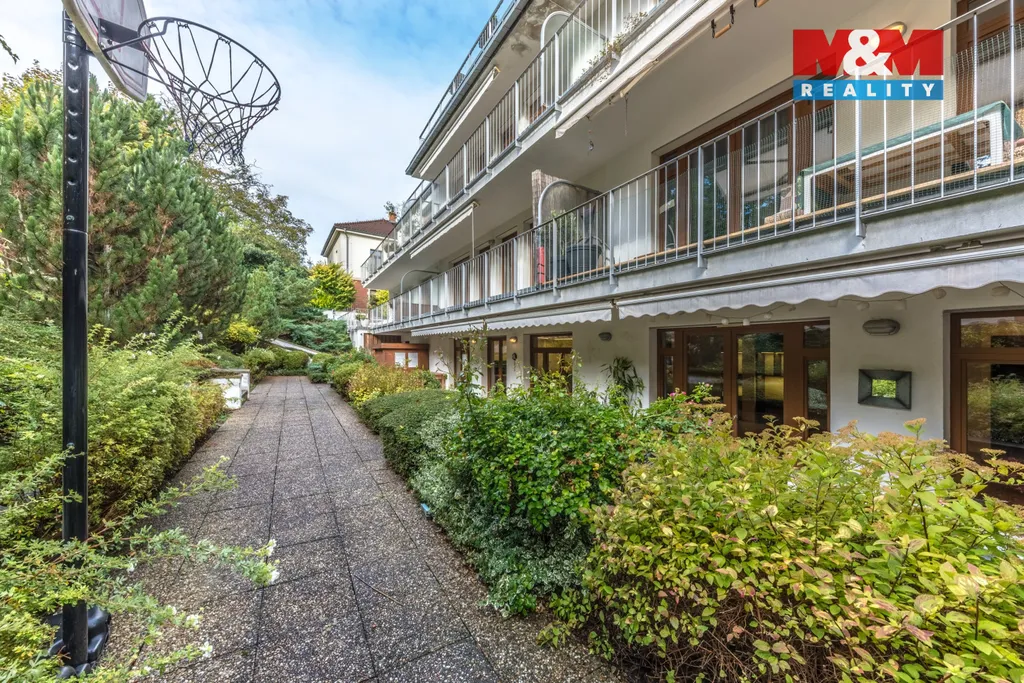 V přízemí se nachází prostorný obývací pokoj s nadstandardně vybavenou kuchyňskou linkou, jídelnou a vstupem na velkou terasu. Dále bar s vinotékou, pracovna, krb, toaleta, úložný prostor a vstupní chodba. V patře jsou tři ložnice, z nichž dva s vestavěnou šatnou. Dvě menší šatny jsou poté na chodbě. K dispozici jsou dvě koupelny s toaletou a balkon o velikosti 14 m², přístupný ze dvou ložnic. K bytu náleží dvě parkovací místa v garáži. Obyvatelé mohou využívat společnou zahradu s posezením a sdílenou saunu. Dům se nachází v oblíbené lokalitě Praha 6 – Břevnov s výbornou dopravní dostupností do centra, v blízkosti letiště i mezinárodních škol. Veškerá občanská vybavenost je v dosahu.