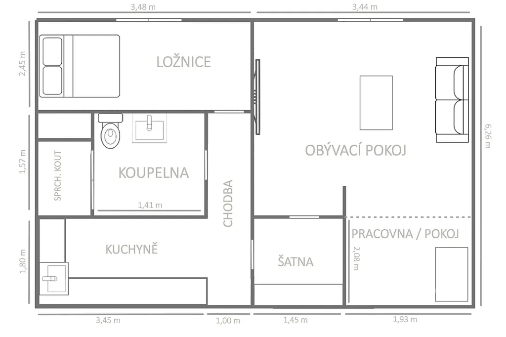 Chytrá dispozice: Kuchyňská linka je efektivně umístěna v předsíni, díky čemuž zůstávají oba pokoje plnohodnotně využitelné jako samostatná ložnice a obývací pokoj. Jeden z pokojů nabízí praktický výklenek pro šatnu nebo domácí pracovnu (viz vizualizace).
