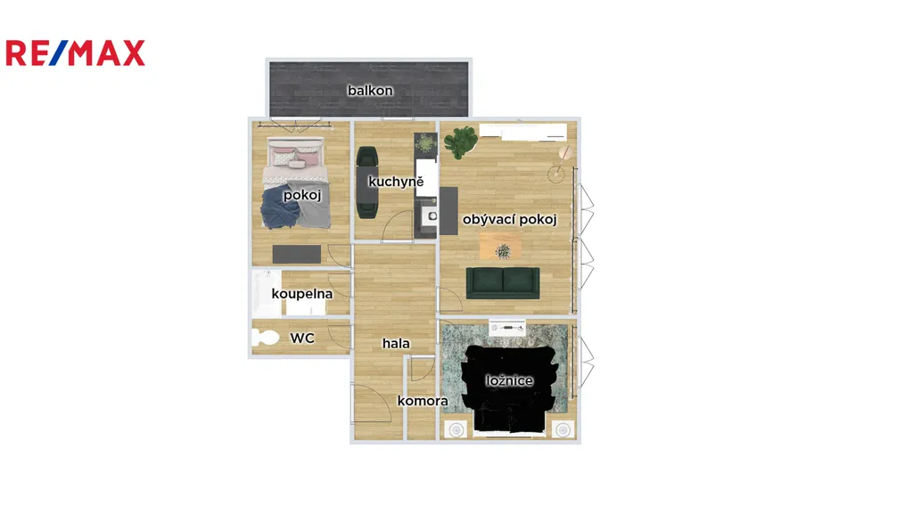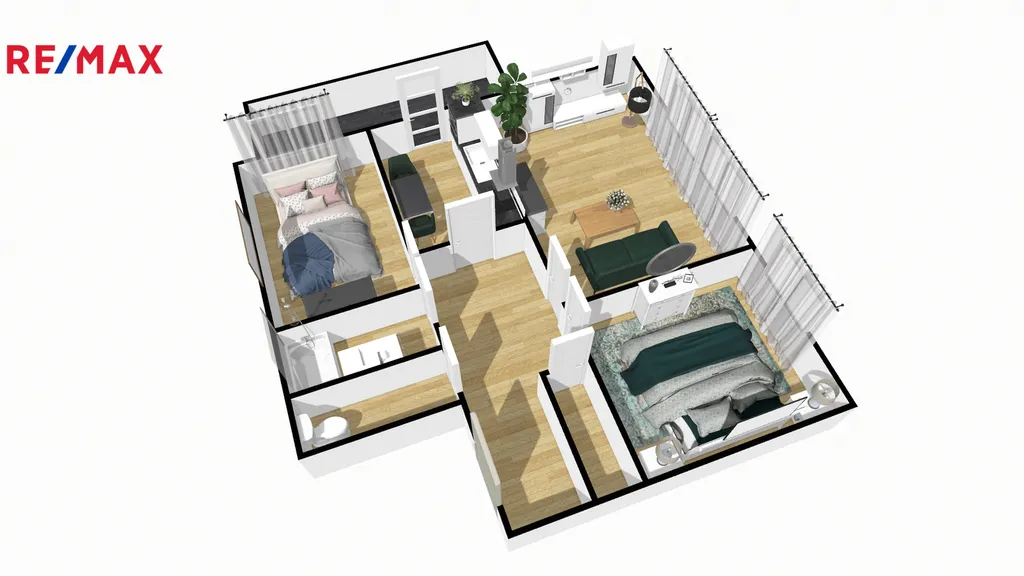 Celková plocha bytu činí 83 m². Kuchyň o velikosti 8.8 m2, obývací pokoj 22,15 m2, pokoj 14 m2, ložnice 10,5 m2, chodba 8,5 m2, koupelna 3,14 m2, WC 1,30 m2, komora 1,40 m2 a prostorný zasklený balkon 9 m2. V obývacím pokoji a v ložnici jsou dřevěné parkety v perfektním stavu, zbytek podlahové krytiny tvoří lino a dlažba. V obývacím pokoji je možnost instalace krbu. Příjemně vás překvapí prostor, který je k dispozici, a dostupnost dvou sklepních prostor o velikosti 6 m², ideální pro uložení potřebného vybavení nebo sezónních předmětů. Dále jsou k dispozici dvě kolárny, sušárna a prádelna.