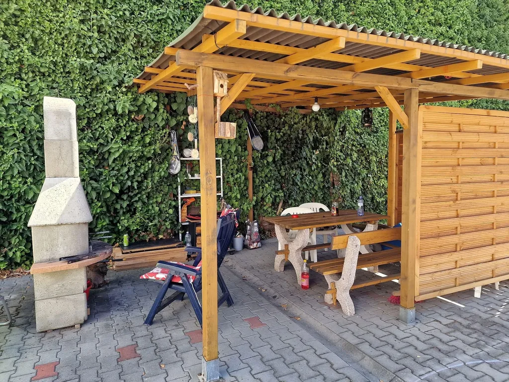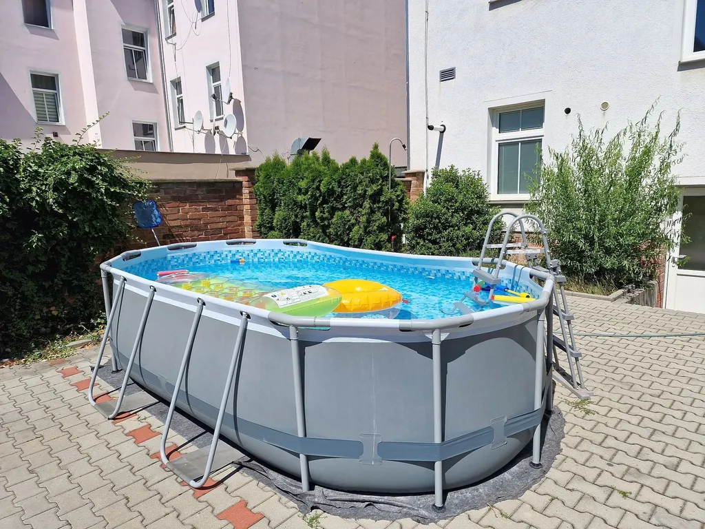 K bytu náleží v ceně nájmu jedno parkovací stání přímo v uzavřeném dvoře, do kterého se zajíždí průjezdem. Dále je možné užívat společnou kolárnu a sklad sezonních či sportovních věcí ve vedlejší stavbě umístěné v zadní části dvora. Nadstandardem nabízeného bytu je možnost využívání uzavřeného vnitrobloku ve dvoře, kde je pro nájemce domu postavená dřevěná zastřešená pergola se zahradním krbem, kde je možné grilovat a trávit volný čas. dále je možné užívat společně s ostatními nájemci velký nafukovací bazén. Náklady na údržbu bazénu si nájemci sami společně regulují a o bazén se starají.