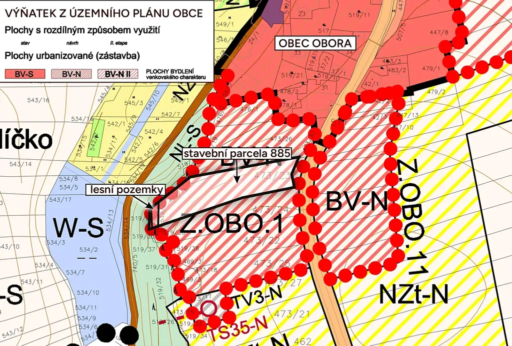 Zapsány jsou parcely pod čísly 519/29, 519/36 a 885 na listu vlastnictví 229. Parcela nejblíže u cesty č. 855 a navazující parcela č. 519/36 leží celou svou plochou ve stavebním území, jedná se o 2 648 m2. Dále pokračuje parcela 519/29, kde se jedná o 23 m2 lesa.