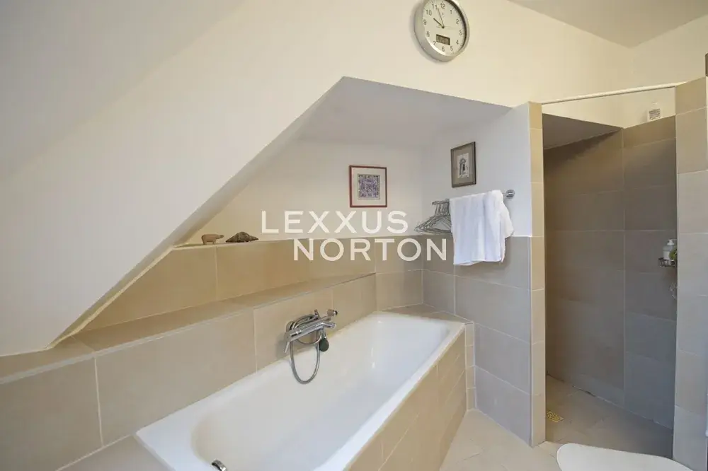 Interiér tvoří vstupní chodba, obývací pokoj s jídelní částí, plně vybavená kuchyň, 5 ložnic přičemž jedna má svou vlastní koupelnu, 4 koupelny, 2 šatny, prádelnu a místnost, kterou lze využít jako hernu, fitness nebo podle svých potřeb. K domu náleží zahrada a 4 parkovací místa.