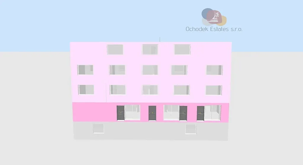 - Přízemí: Dva komerční prostory, každý 100 m2 s velkými výlohami, původně čtyři menší jednotky. Maximální viditelnost z tramvaje.