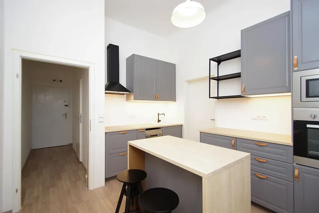 Krásný zrekonstruovaný byt 1+1, s obytnou plochou 42 m2, se nachází ve 4.patře udržovaného secesního domu bez výtahu, v prestižní lokalitě Praha 2 Vinohrady, u parku Riegrovy sady. Interiér bytu je nezařízený a dispozičně nabízí vstupní chodbu s úložným prostorem, velký pokoj (24 m2) s renovovanými původními parketami, kuchyní s vybavenou novou kuchyňskou linkou ve světle šedém odstínu včetně spotřebičů (myčka, elektrická varná deska, ergonomicky umístěná horkovzdušná a mikrovlnná trouba, lednice s mrazákem) a kuchyňským ostrůvkem, dále světlou prostornou ložnici, moderní koupelnu se sprchovým koutem, toaletou a pračkou. Byt je vytápěn plynovým kondenzačním kotlem Bosch (ekonomický provoz).