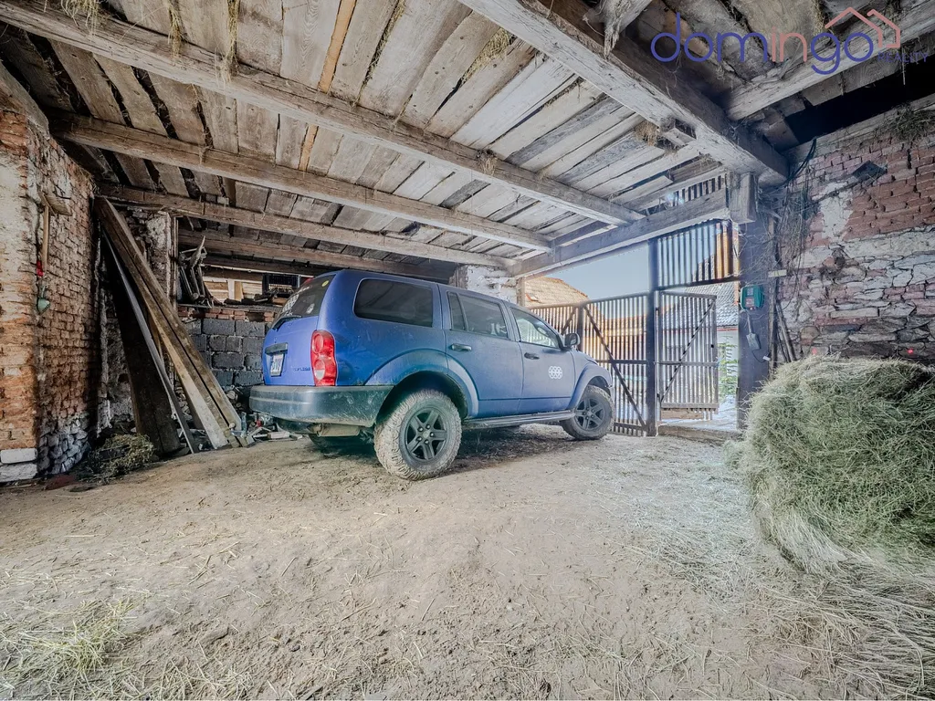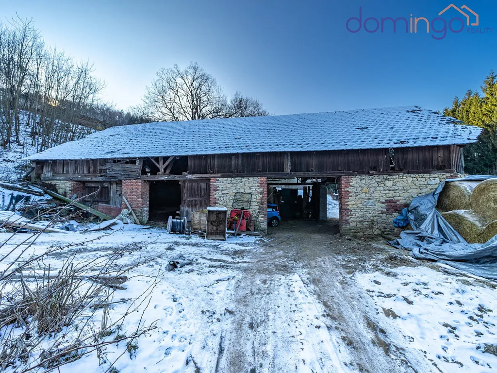 Za hlavním stavením se nachází bývalé stáje a sklep vyzděný do terénu určený ke skladování úrody – chladný, funkční a stále plně využitelný. Celým pozemkem vede soukromá cesta, která umožní dostat se autem až nahoru na kopec.