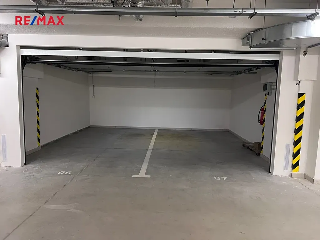 Do domovní garáže je vjezd přes vrata s dálkovým ovládáním, samotná garáž má další sekční vrata na DO.
