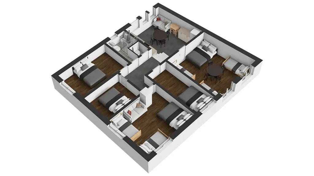 Byt 6+kk je přístupný po schodišti ze dvorní části a je opět dvou úrovňový. V nižší části se nachází kuchyně s jídelnou a velká ložnice s 5 lůžky. Ze vstupní místnosti vede 5 schodů do vyšší úrovně bytu, kde jsou 2 menší a 2 větší ložnice, koupelna s WC a další samostatné WC.
