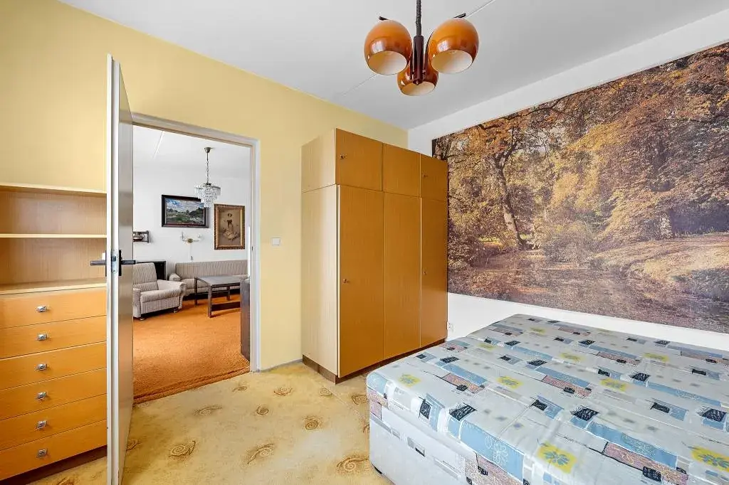 Disponuje velkou předsíní do tvaru písmene L, odkud je z její jedné části vstup do prostorného obývacího pokoje se vstupem na zasklený balkon, dále je zde vstup do pokoje využívaného jako ložnice, také do dalšího pokoje a to pracovny. Z druhé části předsíně je vstup do koupelny, WC a kuchyně.