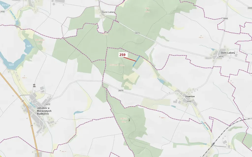 Lesní pozemek o výměře 6 645 m2, parcelní číslo 259, podíl 1/1, katastrální území Vícenice u Dolních Lažan, obec Vícenice, obec s rozšířenou působností Moravské Budějovice, okres Třebíč, Kraj Vysočina. .