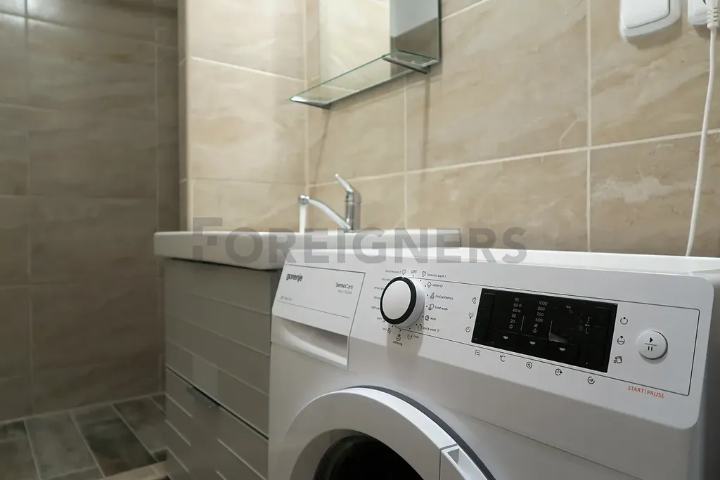 Koupelna je vybavena sprchou, umyvadlem a pračkou.