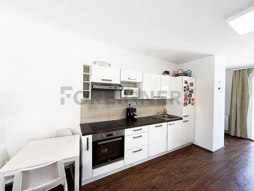Byt sestává z předsíně (11,38 m2), chodby (3,86 m2), šatny (4,76 m2), ložnice (18,11 m2) a pokoje s kuchyňským koutem (23,40 m2). Kuchyň zahrnuje kuchyňskou linku s vestavěnými spotřebiči – troubou, varnou deskou, digestoří a lednicí. Dále pak koupelna (4,98 m2) se sprchovým koutem a toaletou. Hlavní místnost je díky velkým plastovým oknům s výhledem do vnitrobloku je příjemně světlá. Vytápění bytu a ohřev vody zajišťuje plynový kotel, spolu s tepelným čerpadlem. Moderně zrekonstruovaný objekt s kamerovým systémem a pravidelným úklidem společných prostor včetně výtahu. Možnost koupě parkovacího stání.