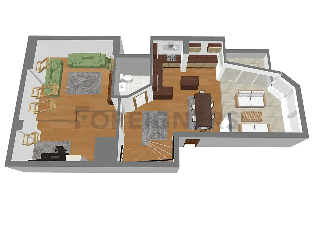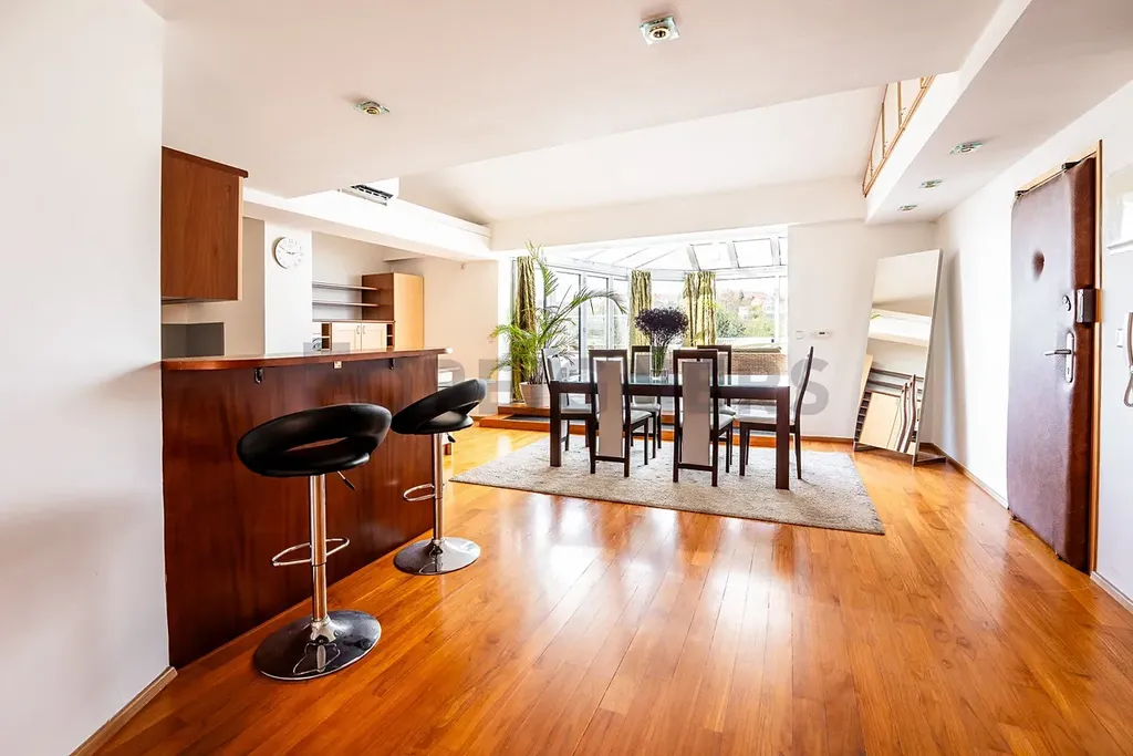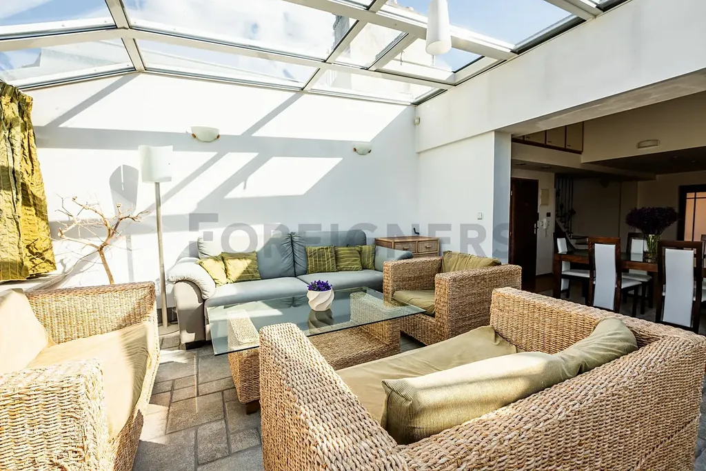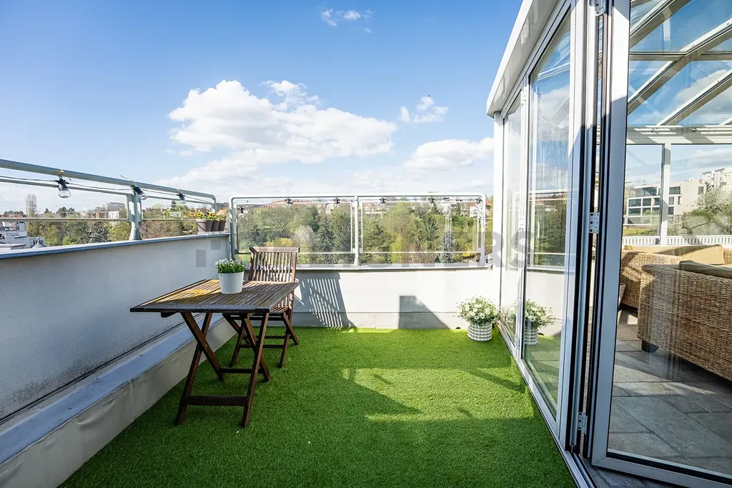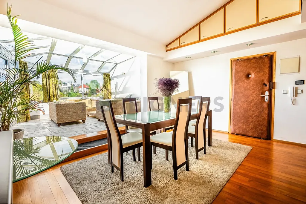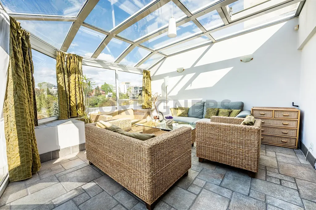 Dominantou bytu je prosklená zimní terasa (19 m²), ideální k relaxaci s výhledem do zeleně. Díky své poloze v posledním patře a pouze dvěma bytovým jednotkám na patře si užijete ničím nerušený klid a soukromí.