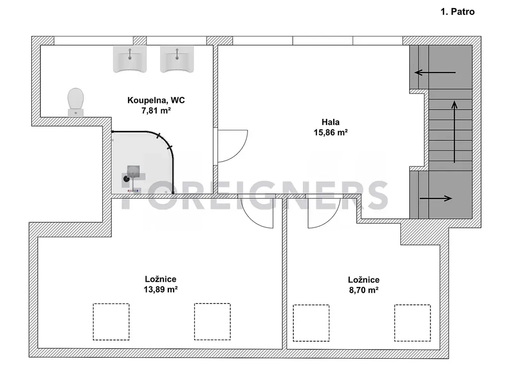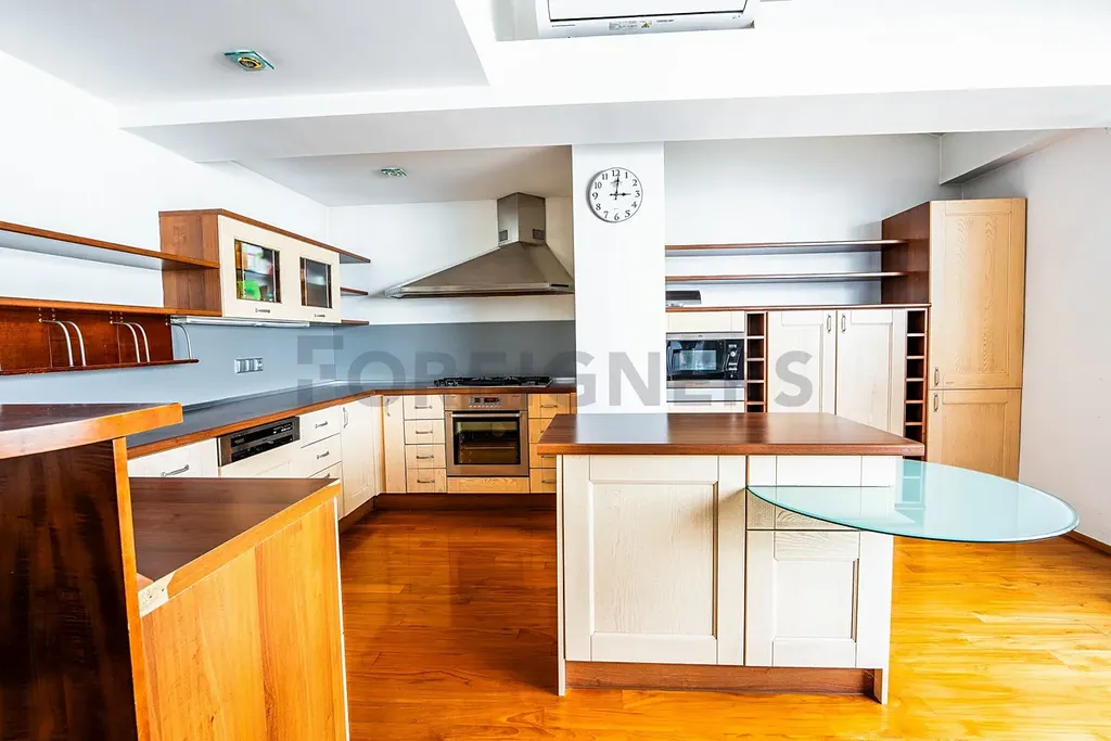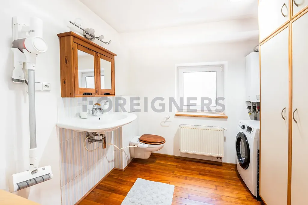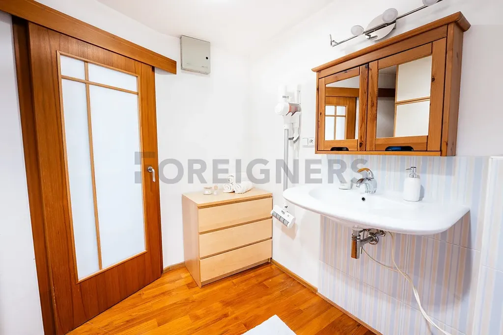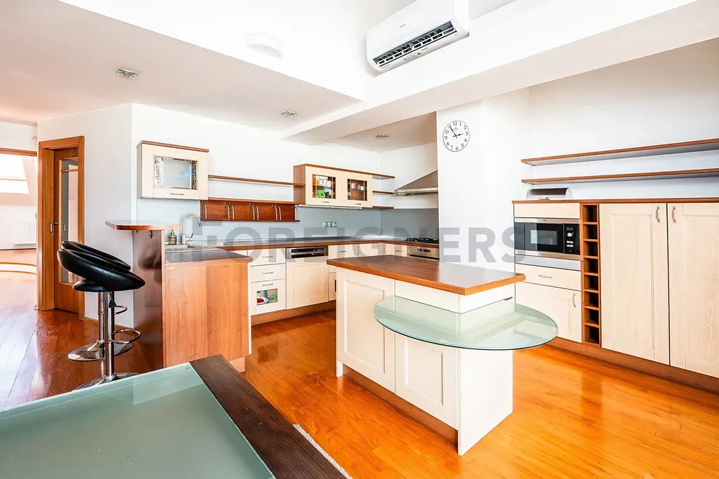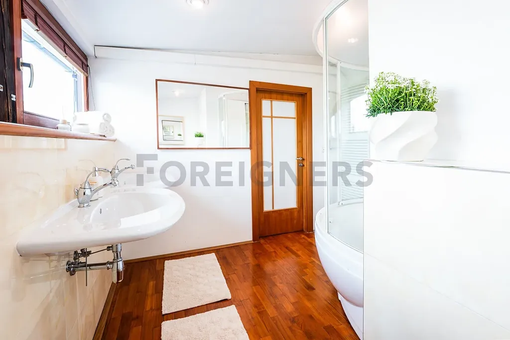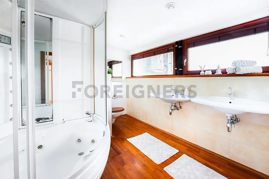 K dispozici jsou dvě koupelny – jedna s rohovou vanou a dvojitým umyvadlem (7,81 m²), druhá s toaletou, pračkou a úložným prostorem (6,63 m²). V bytě nechybí klimatizace a kvalitní dřevěné podlahy, které podtrhují příjemnou atmosféru domova.