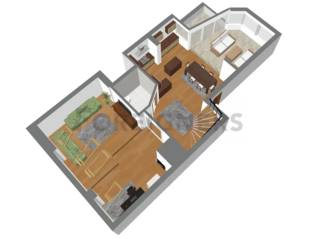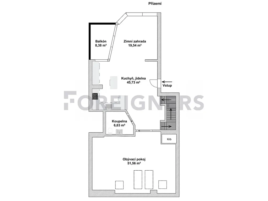 Byt se skládá z několika prostorných a světlých místností s vestavěnými úložnými skříněmi. Ložnice (13,89 m²), pokoj (8,7 m²), oddělená kuchyň (45,73 m²) a obývací část (51,56 m²) propojují eleganci s praktičností. Kuchyně i obývací pokoj mají přímý vstup na zimní terasu i balkon (8,38 m²).