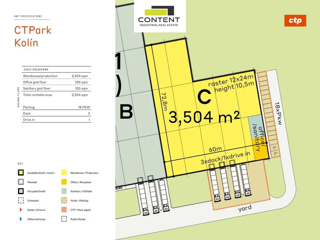 - samostatné industriální prostory 3504 m² (budova KOLN1)