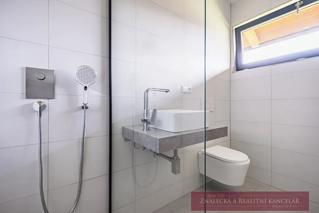 Koupelna se sprchovým koutem a toaletou (podlahové vytápění)