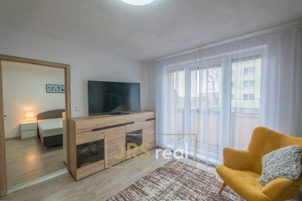 Po levé straně chodby vstoupíte do obývacího pokoje, který je také plně vybavený nábytkem včetně sedací soupravy, úložných skříněk a televize. Z obývacího pokoje je přímý vstup na balkón, který poskytuje příjemný prostor k odpočinku, a dále také vstup do ložnice. Ta nabízí kompletní vybavení manželská postel, noční stolky i šatní skříň.