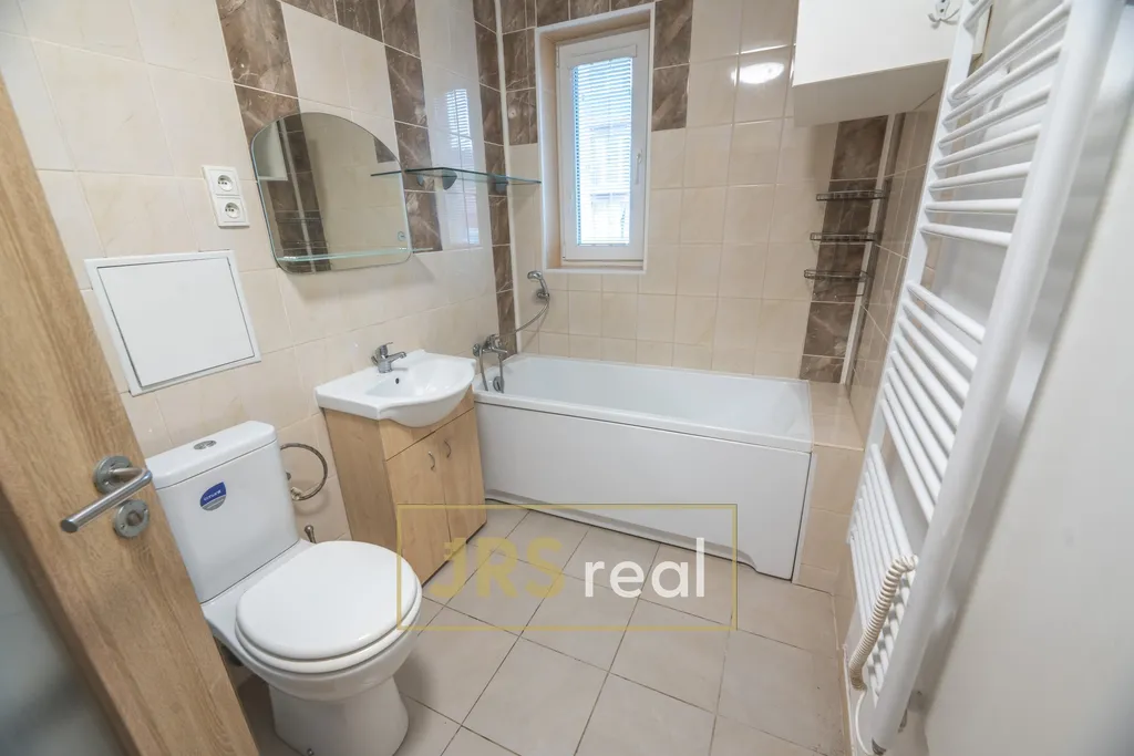 Koupelna je společná s WC a je vybavena vanou, umyvadlem se skříňkou, zrcadlem, topným žebříkem a také pračkou.