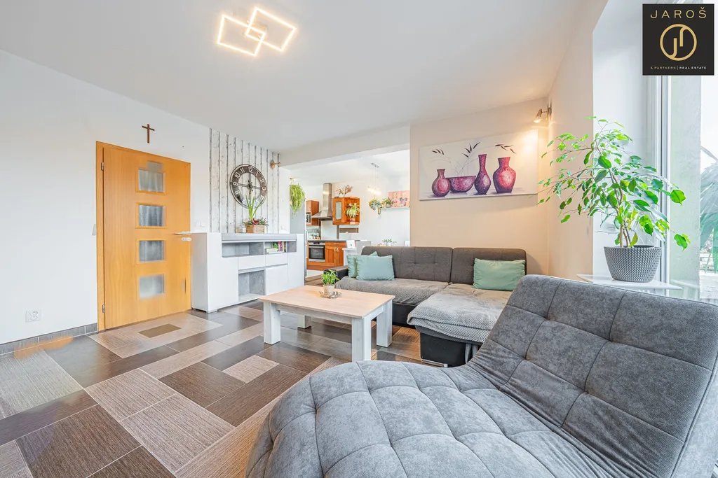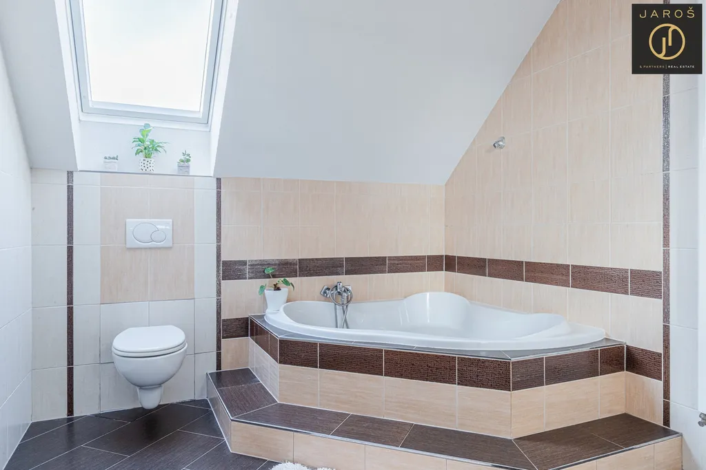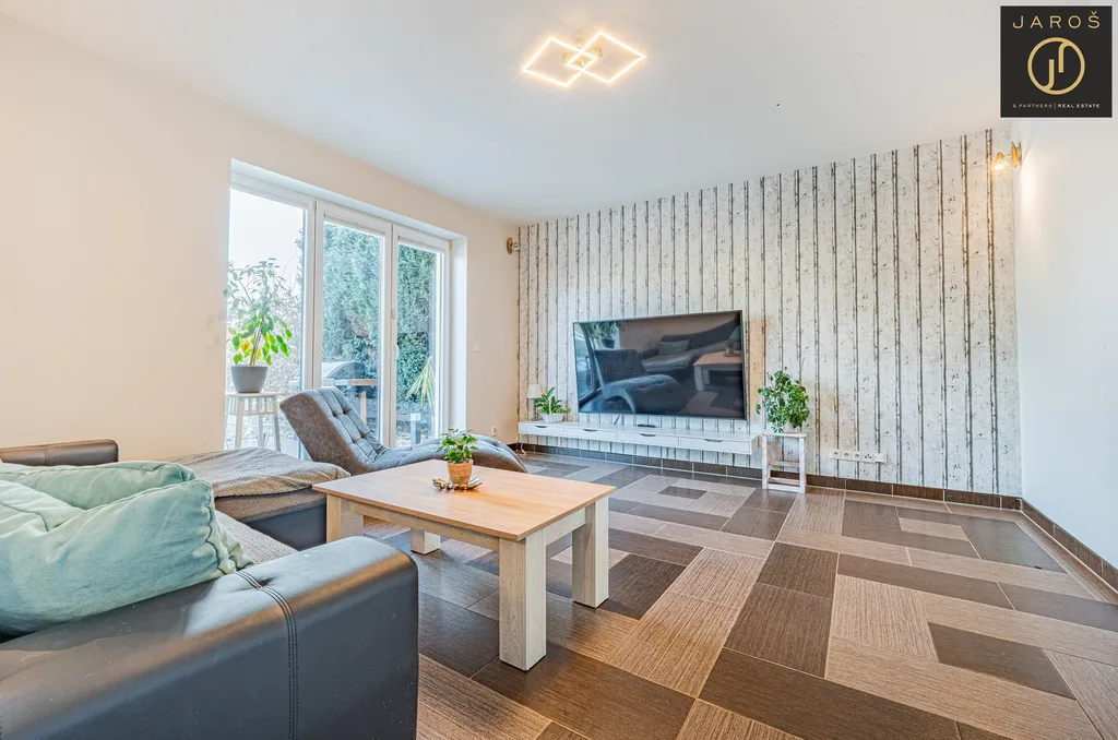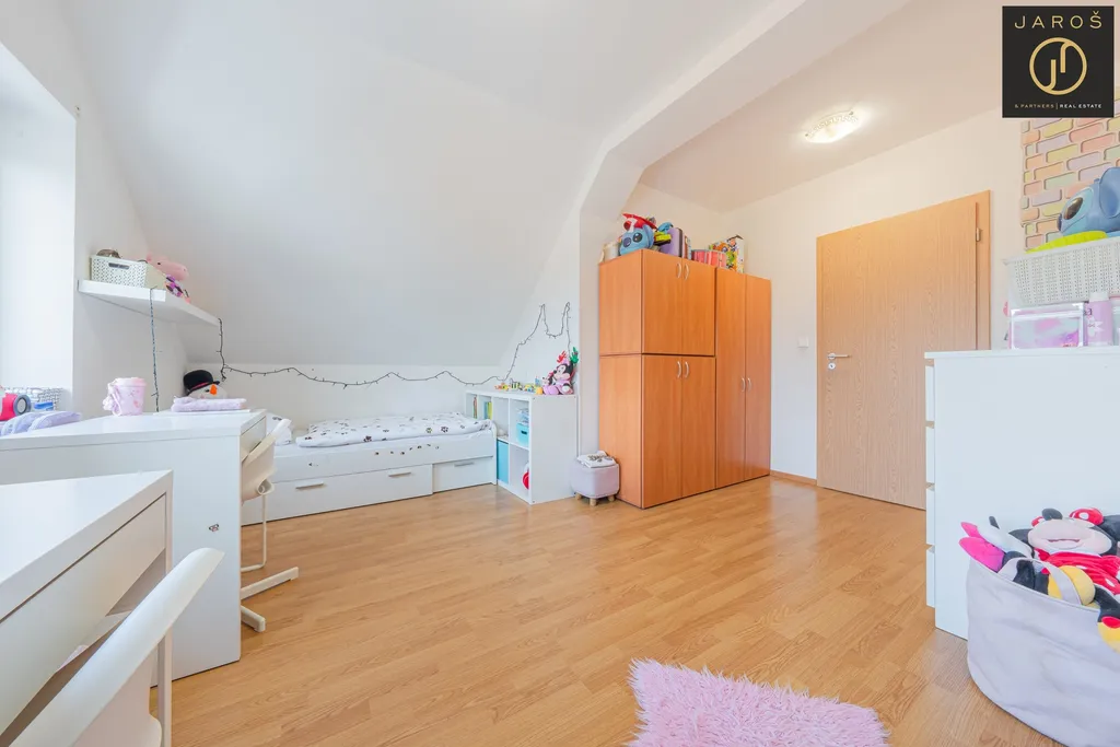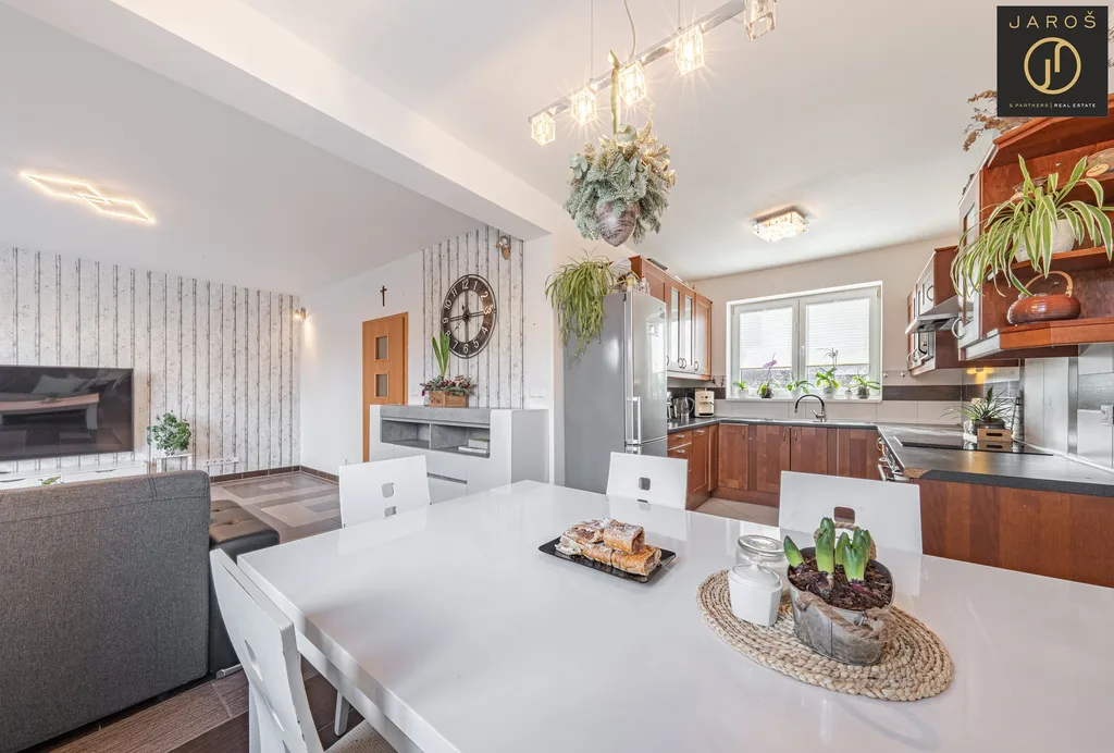 Dispozičně je dům řešen velmi prakticky. V přízemí se nachází zádveří, chodba s vestavnou skříní, samostatné WC, technická místnost, spíž a obývací pokoj s kuchyní a jídelním koutem. Z obývací části je přímý vstup francouzským oknem na terasu a zahradu. V patře je umístěna prostorná koupelna s rohovou vanou, ložnice a dětský pokoj, dále je k dispozici půdní prostor pro případné uložení nepotřebných věcí.