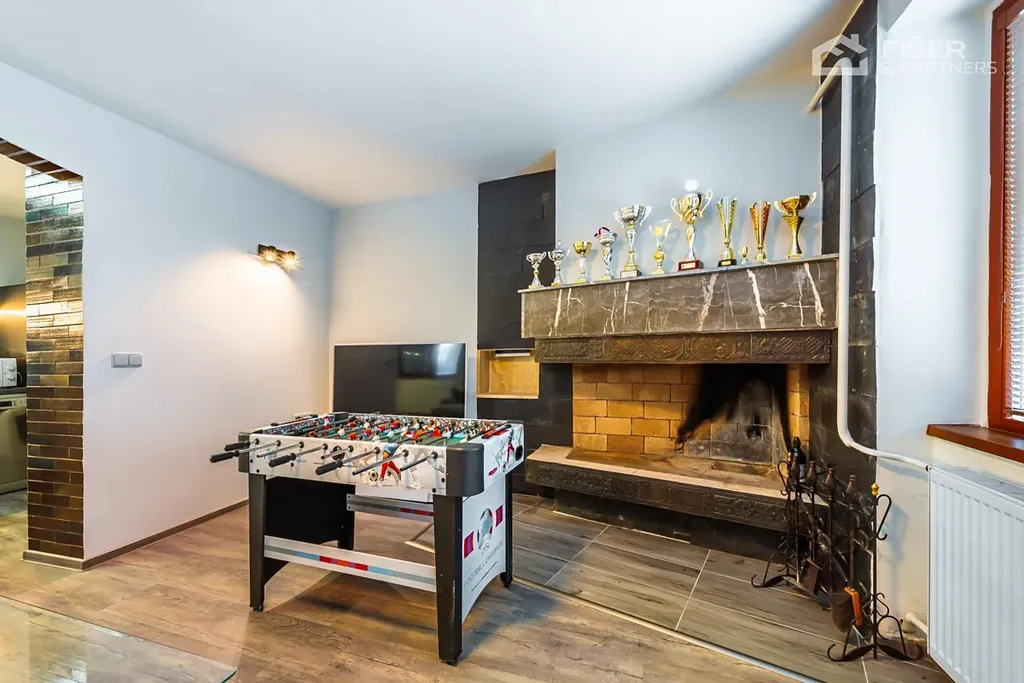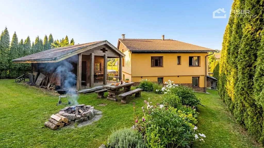Interiér domu je logicky rozdělen tak, aby poskytoval dostatek soukromí všem členům domácnosti. Přízemí i patro nabízejí plnohodnotné dispozice, které lze využívat nezávisle na sobě. Srdcem pozemku o rozloze 800 m2 je kromě samotného domu také stylový zahradní domek, který není jen obyčejným skladem nářadí. Je vybaven vlastním barem a prostorem pro spaní, což z něj dělá ideální místo pro letní večery s přáteli nebo zázemí pro hosty. Parkování je vyřešeno prostornou garáží přímo v domě a dalšími parkovacími místy na vlastním pozemku před vstupem.