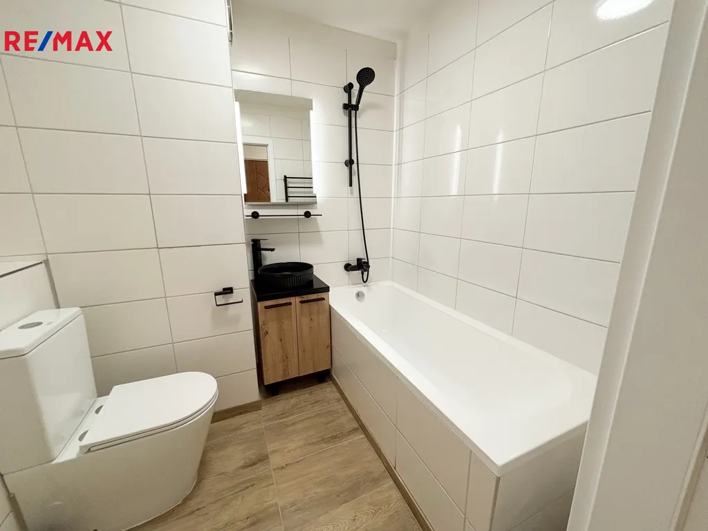 V koupelně se nachází vana, umyvadlo a toaleta, přičemž bude zároveň dodána nová pračka. Velkou předností je plně vybavená kuchyňská linka se zabudovanými spotřebiči: elektrická trouba, indukční varná deska, mikrovlnná trouba, digestoř, myčka nádobí a lednice s mrazákem. Ložnici i obývací část si pak můžete zařídit podle vlastních potřeb a představ.