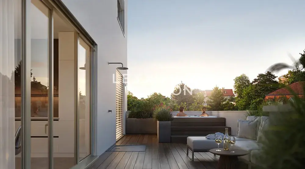Celý byt je navržen s důrazem na detail i pohodlí. Hliníková okna s izolačním trojsklem jsou vybavena elektricky ovládanými venkovními žaluziemi, což zaručuje klid, soukromí i optimální vnitřní klima během celého roku. V obytných místnostech najdete dřevěné dubové parkety, které podtrhují elegantní a hřejivou atmosféru domova. Stropní vytápění a chlazení lze pohodlně ovládat i prostřednictvím mobilní aplikace. O kvalitu vzduchu se stará centrální rekuperace se zajištěním čerstvého vzduchu v celém bytě.