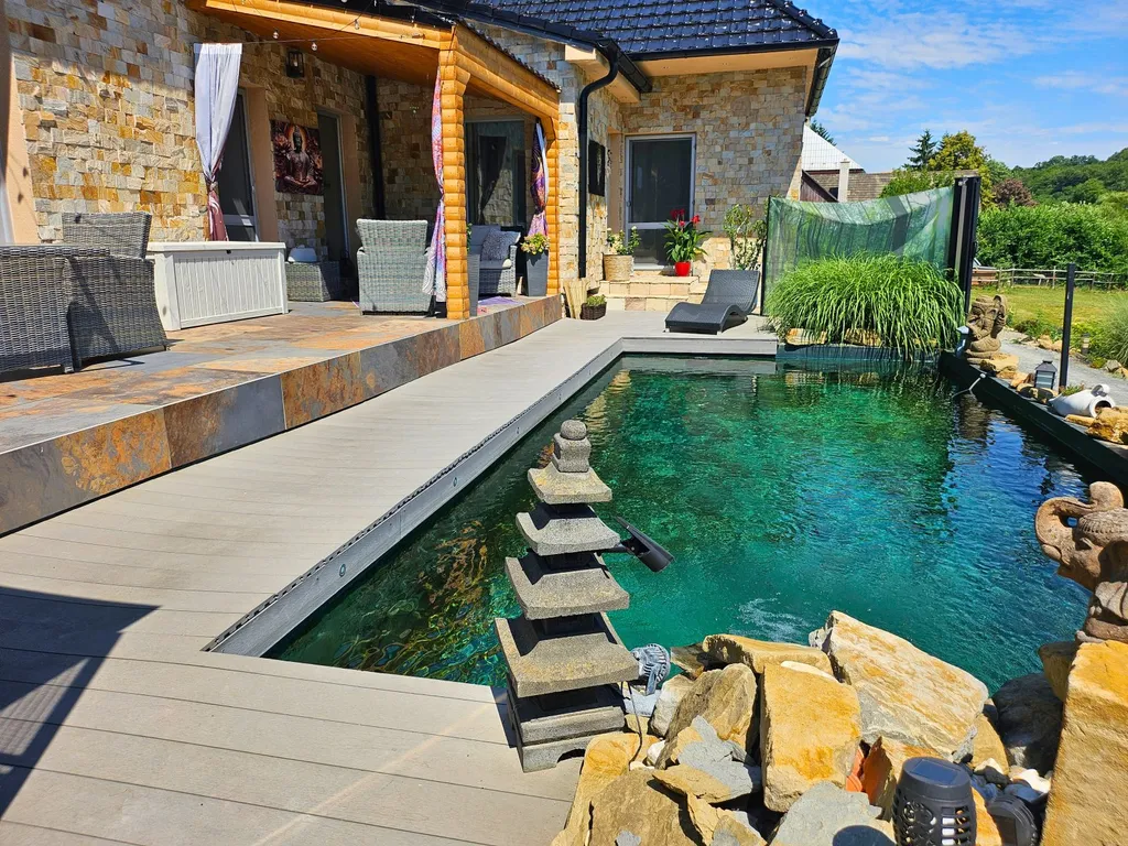 Dominantou venkovní části je přírodní koupací jezírko lemované kamenem, travinami a relaxační zónou. Z terasy si užijete výhled na zelené kopce a zalesněný svah, zatímco ve vzduchu voní levandule, rozmarýn a letní pohoda.