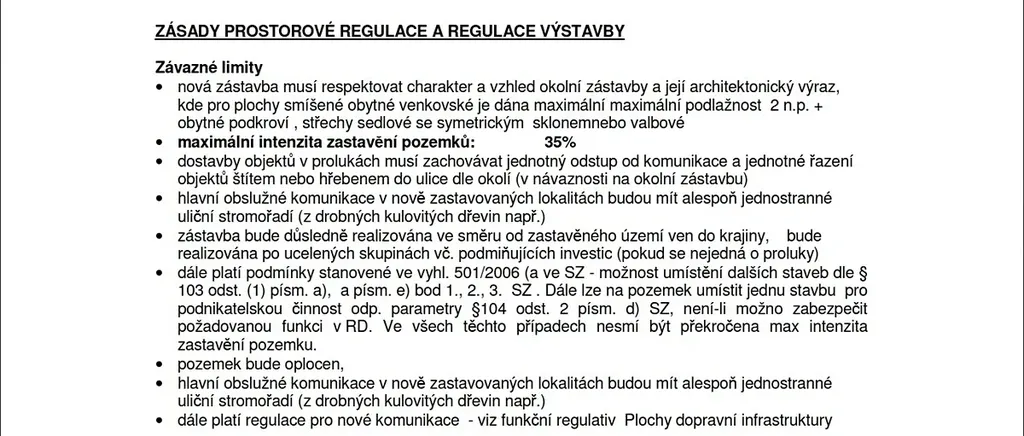 Dle územního plánu je celková plocha pozemku pro výstavbu (včetně stávajících budov) 5 300 m², vedená jako plochy smíšené obytné venkovské (SV). Tyto pozemky umožňují:
