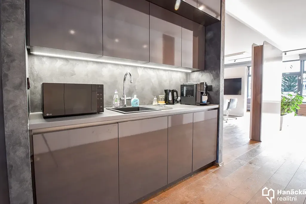 Prostory jsou kompletně vybavené a připravené k okamžitému užívání bez nutnosti dalších investic. Součástí kanceláře je kvalitní kancelářský nábytek včetně pracovních stolů, dvě klimatizační jednotky Samsung, videotelefon, chytré zámky ovládané pomocí mobilní aplikace a elektricky ovládané rolety Somfy. Vysoký standard doplňuje plně vybavená kuchyň a moderní sociální zázemí s WC a sprchovým koutem.