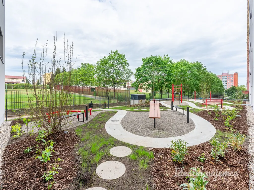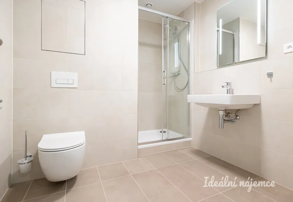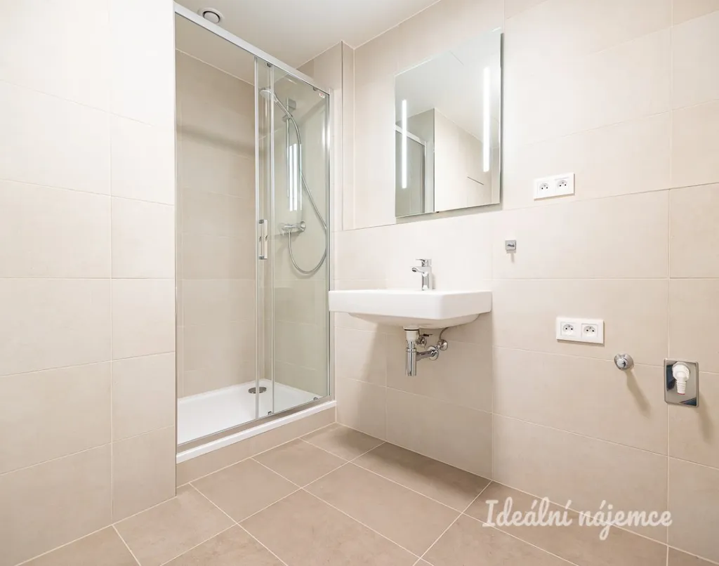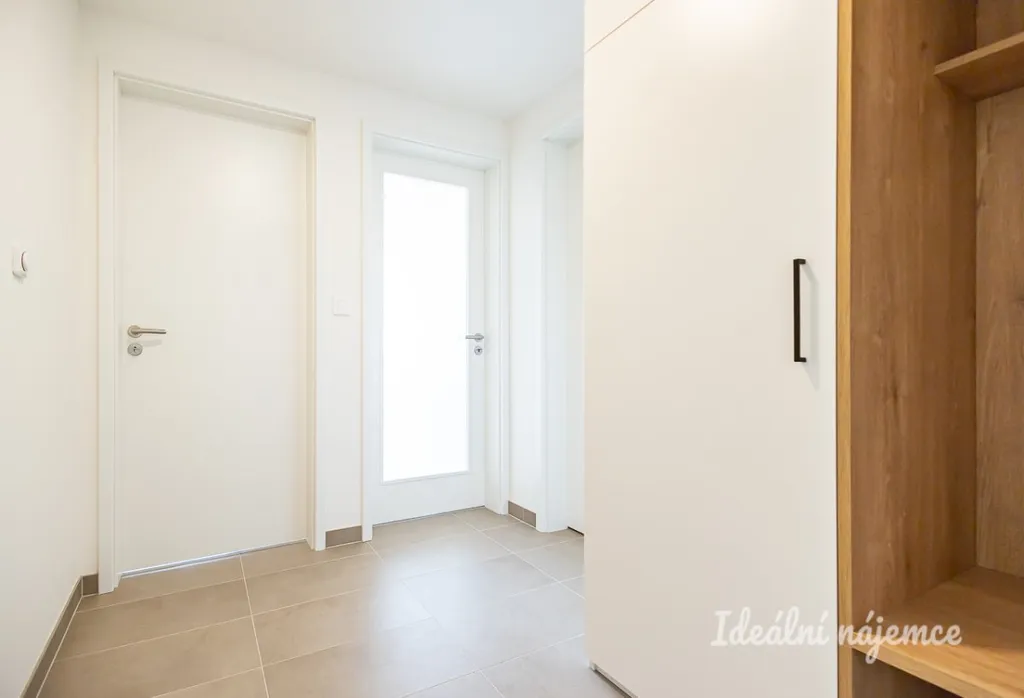 V předsíni se nachází vestavěná šatní skříň s věšákem. Z předsíně se dostaneme do obývacího pokoje s kuchyňským koutem. Kuchyně se nabízí plně vybavena vestavnými spotřebiči - lednice s mrazákem, myčka nádobí, indukční varná deska, elektrická trouba a digestoř značek Electrolux a Liebherr. Obývací pokoj i ložnice jsou nezařízené. V koupelně se nachází sprchový kout, závěsná sanita a přípojka s vývodem na pračku. Okna jsou zde kvalitní trojskla s výbornou tepelnou i zvukovou izolací.