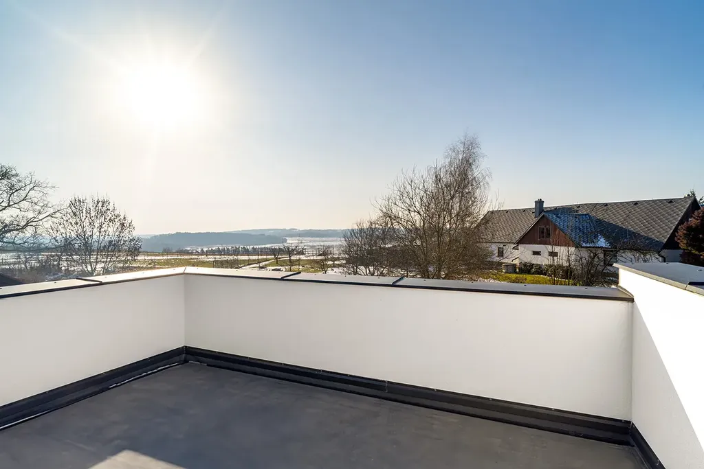 V podkroví je další prostorný pokoj s přístupem na terasu 15,5 m², vhodný například jako pracovna, ateliér nebo pokoj pro hosty.